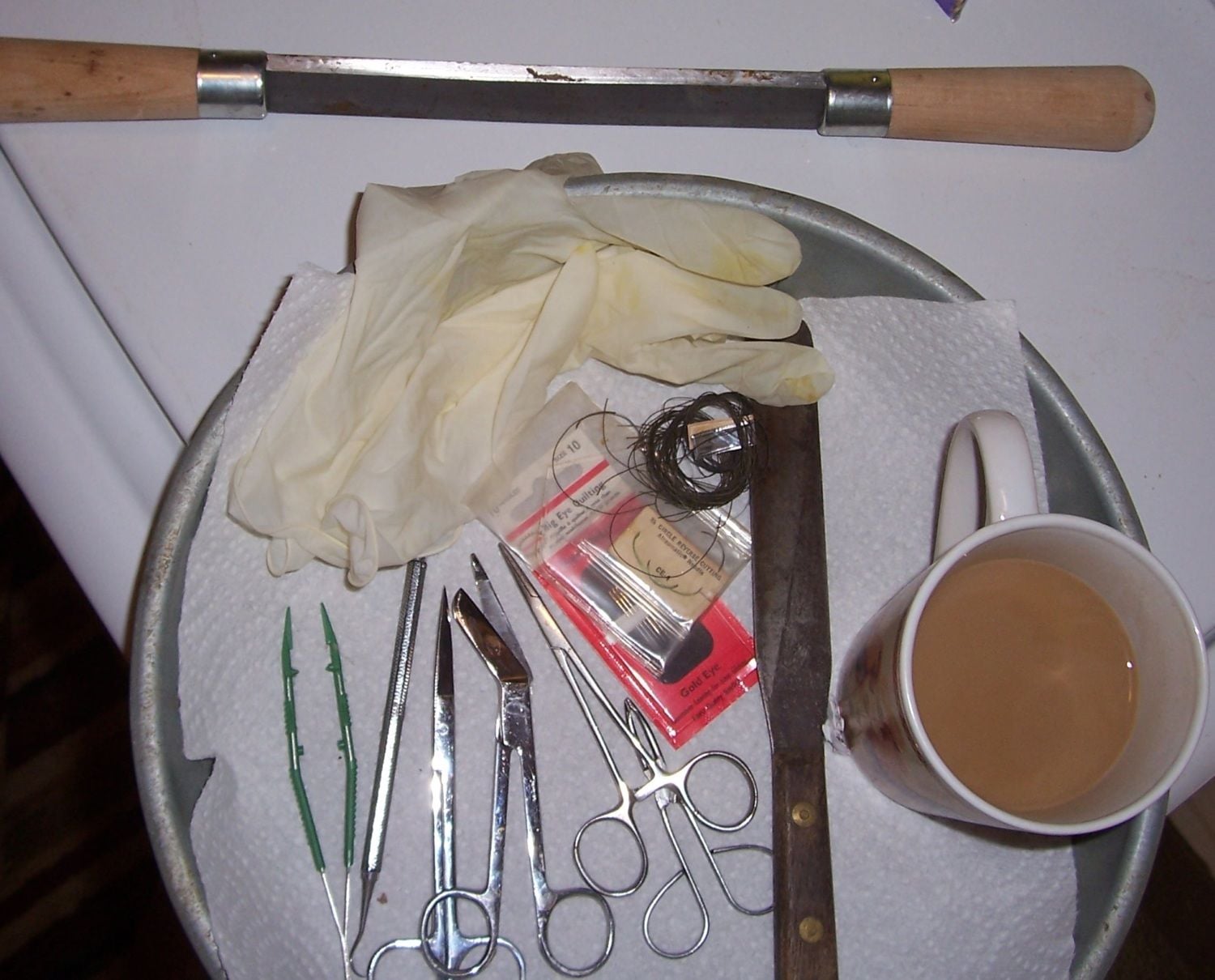 Spent some time this morning suturing up the holes in the hide. A few supplies and coffee, holes, and repair.
