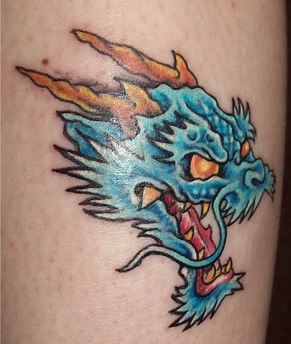 After an hour of searching I spotted a blue Asian style dragon head. I have always loved reptiles of any sort and the color blue since I was young. I at least knew it wasn't something that I had only been interested in for a while that I would hate later. I told him that I wanted that one but without the red flame around the head (wasn't sure how bad it would hurt and if I wanted to add more later). He then asked me what size. Due to me loving art and tattoos I spent years of online tattoo searching images and knew the bigger would be better for details especially as the body ages. I decided to have it on the side of my right calf but up higher than my ankle since I would like to add a body to it later. I also don't wear shorts to often since I prefer pants so it isn't something that shows often.