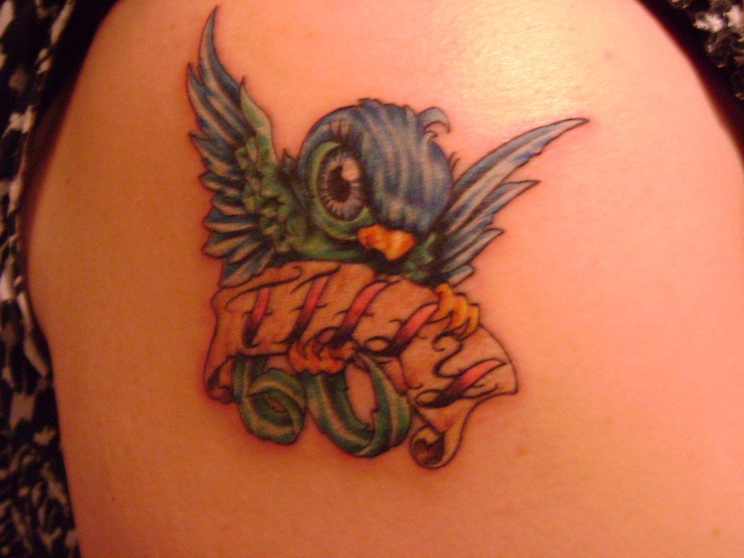 Not a chicken but a blue bird. This one cost me $80 plus a $25 tip. It says Tilly which is my youngest daughter's name. I have a few others but can't find the pics for them... I want to get a tat of my Frizzle Cinnamon. I think it would make for an awesome tat.