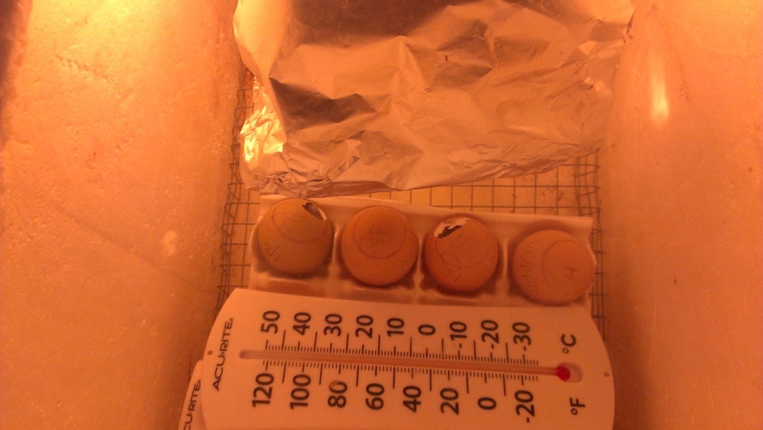 These are the eggs I've got in the incubator right now. At the top is the heat diffuser I installed (that is the aluminum foil I put around the light bulb. lol)