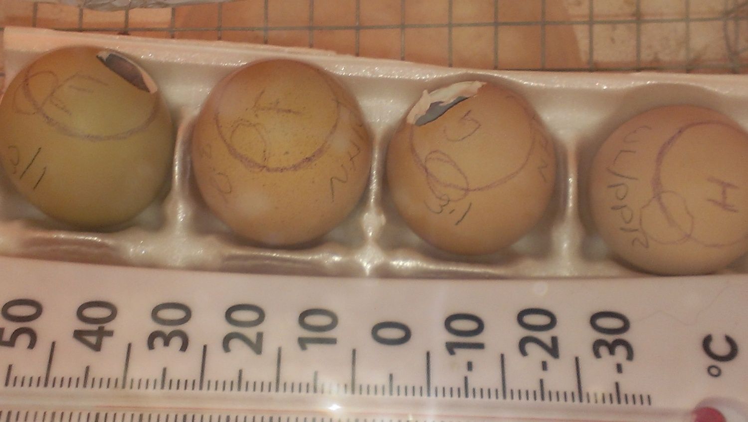 Here's a better pic of the holes I chipped in the two eggs that I don't think are going to hatch.