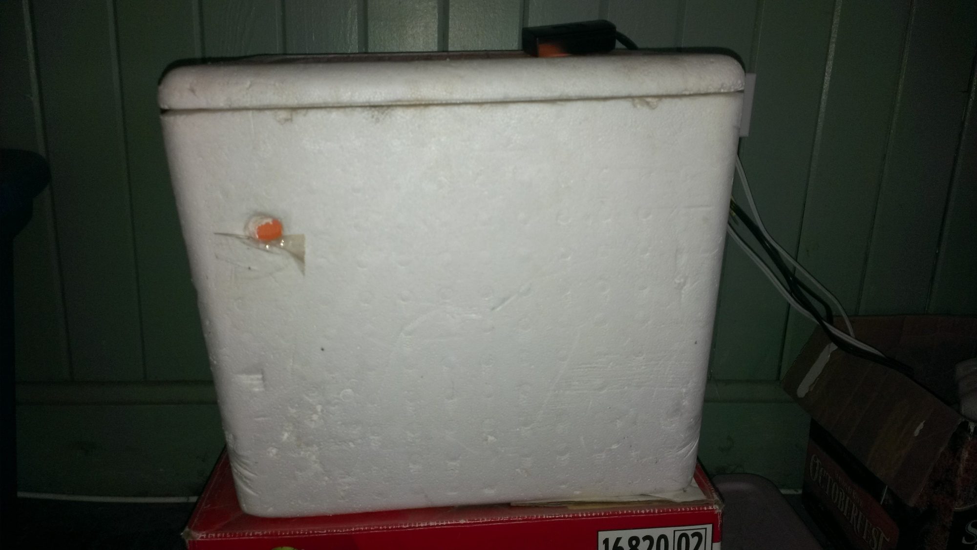 This is the front. It's just a simple, small chest cooler. The white wire going to the right is for the light bulb and the black one is for the dimmer switch. The yellow spot at the top left of the cooler is a hole for ventilation and temperature regulation (if it gets too cold in there and the light bulb is on full power, you could tape over this hole, or if the humidity is getting too low you could cover it as well).