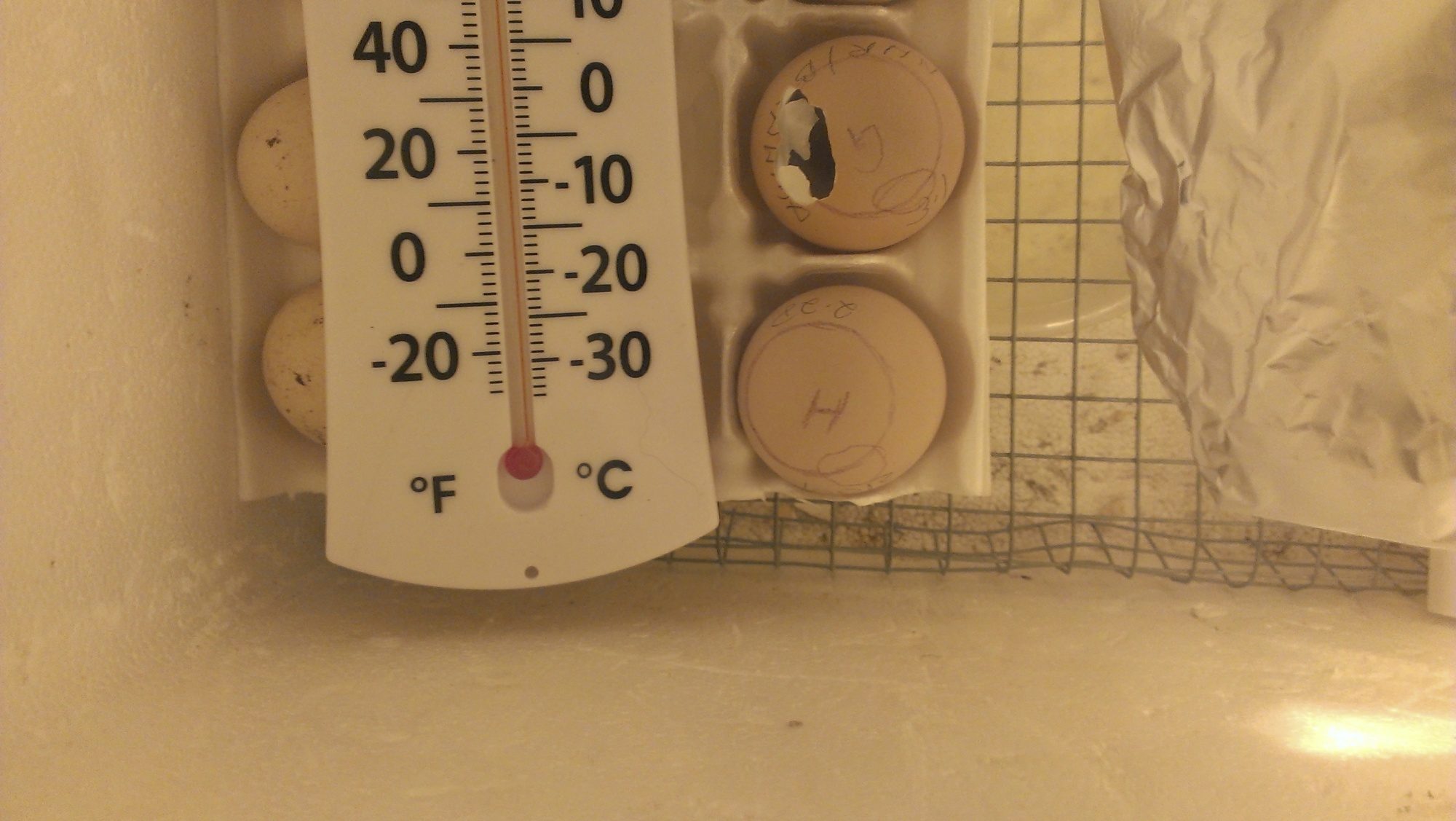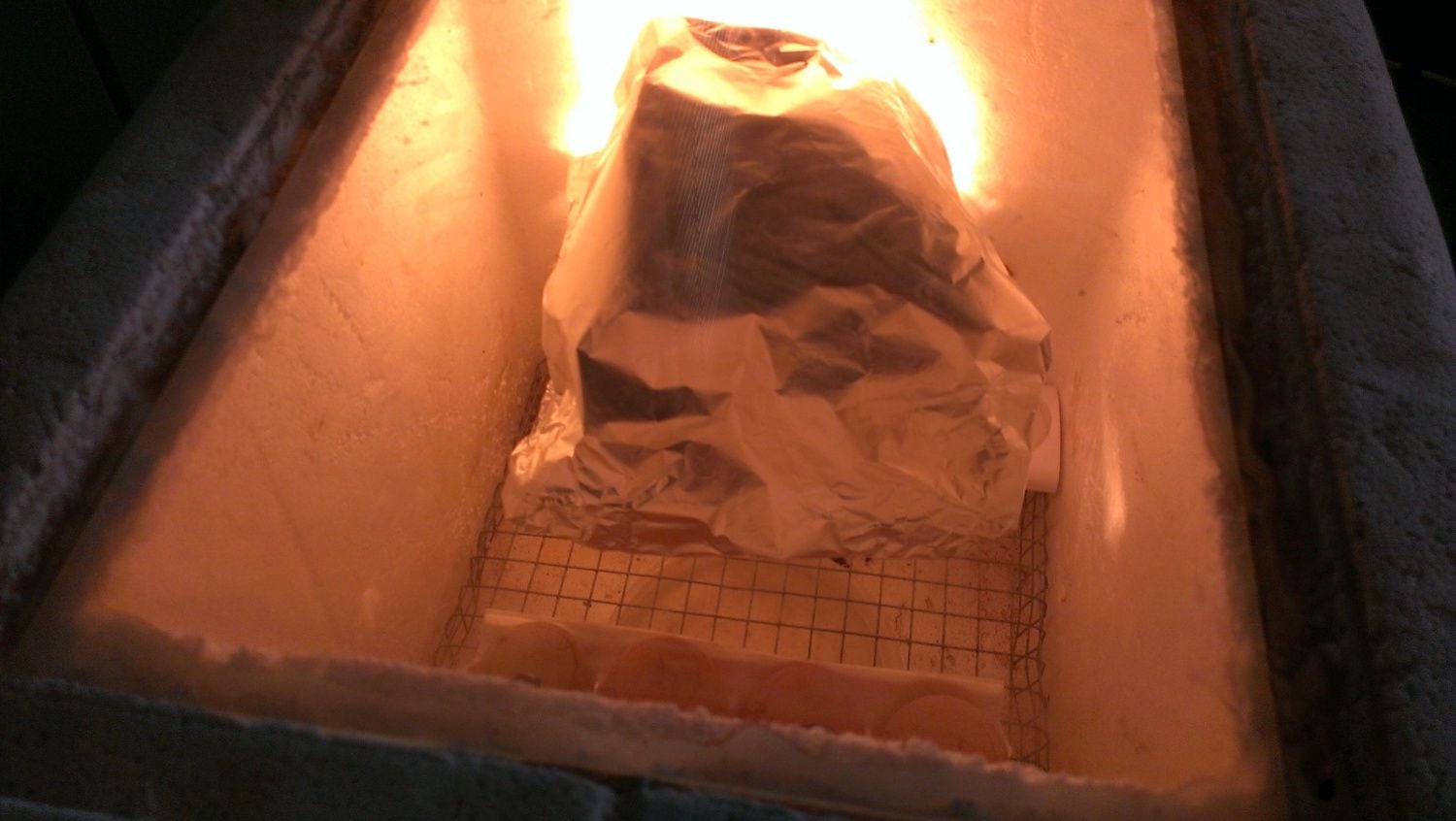 This picture is from the egg end of the incubator. The eggs are at the bottom of the picture and the aluminum foil I put around the light bulb is the weird dark shape with light shining around the top and sides of it is my super fancy heat diffuser. lol The aluminum foil covered platform made of half-inch welded wire isn't visible. I think there's a picture a bit further back that shows the incubator before I installed the heat diffuser.