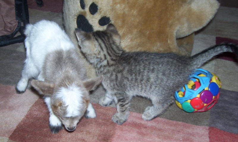 Here she is with a 5 week old kitten and in the other pic with mom and brother.