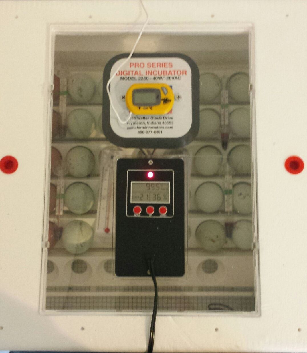 Ok, so I recently purchased a Farm Innovators Circulated Air 2250 Model Styrofoam Incubator. I also purchased the Farm Innovators 3200 model automatic egg turner. It has a digital thermostat which shows internal relative humidity, internal temperature, and days to hatch. I have read reviews which state, as usual, that you should not go by the built in digital thermometer reading. With that said, I have placed 4 glass tube aquarium thermometers wedged between eggs in the 4 main areas of the incubator (top left, bottom left, top right, and bottom right). I also use a digital zoo-med thermometer with probe to go down through the vent holes and spot check different areas of the incubator. I have the thermostat set at 100 degrees and have just began day 2 of incubation (or on countdown says day 20). I have found that on the right side of the incubator the temp seems to be pretty stable with slight fluctuations between 99 degrees F and 100 degrees F; however, on the left side it seems to stay around 98 degrees F with fluctuations up to not much higher than 98.5 degrees F. Humidity seems to be pretty stable, but that's not hard to accomplish in Florida where the humidity is always high. I worry about the eggs on the left side of the incubator being at too low a temperature, and I'm not sure what the best action to take would be. If I up the thermostat to 100.5 degrees or 101 degrees it would probably bring the left side eggs up to the ideal temp of 99.5 - 100 degrees F; however, I worry it would spike the right side that is already at the ideal temp range to a range that is too high and will cook my eggs. Any suggestions or help would be much appreciated. Below is some pictures of the incubator I am using. Thanks!