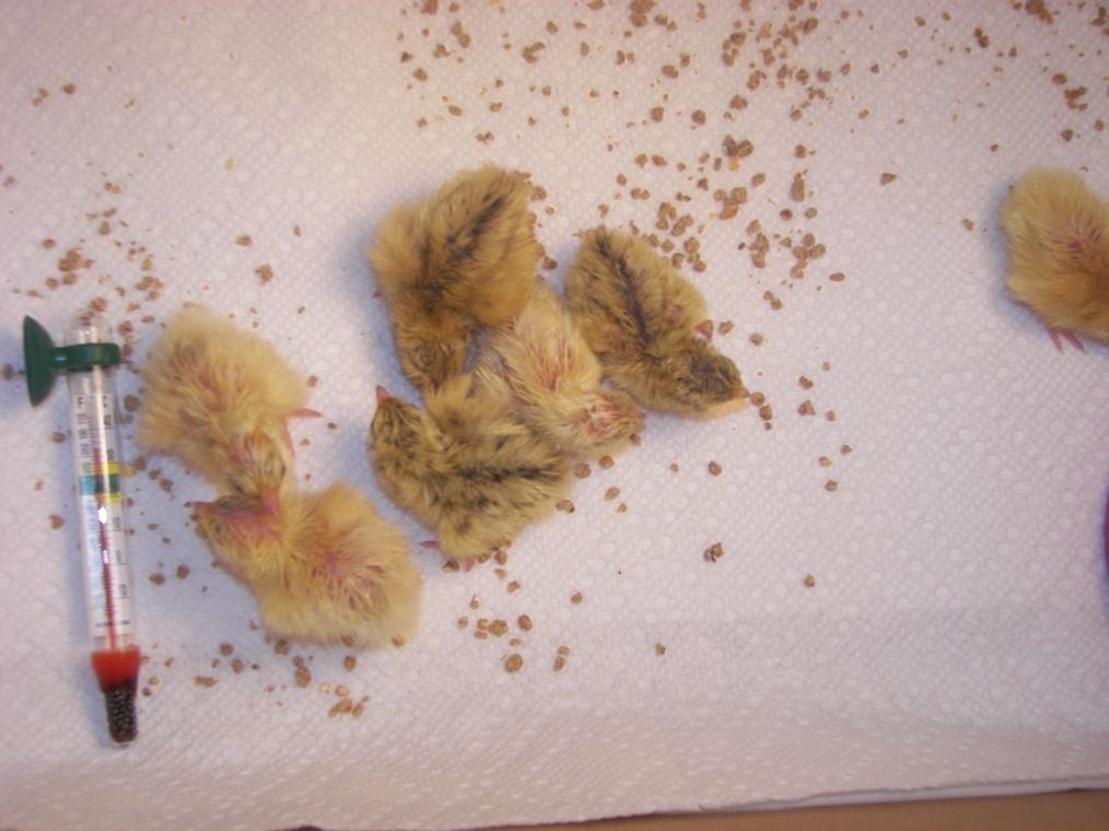 Well, long story short, the 1 A&M survived. As luck would have it it was a male. We got a couple of A&M females to go with it. We also acquired a pair of golden manchurians. Our first batch of 10 eggs hatched out 7 peeps. 4 A&M's and 3 GM. The kids were so excited. My daughter was insistent on hatching eggs that were laid by her birds -- I tried to convince her to accept an offer of 50 fresh eggs but she simply said, "maybe later." Here is a pic of the peeps at about 10 hrs old.