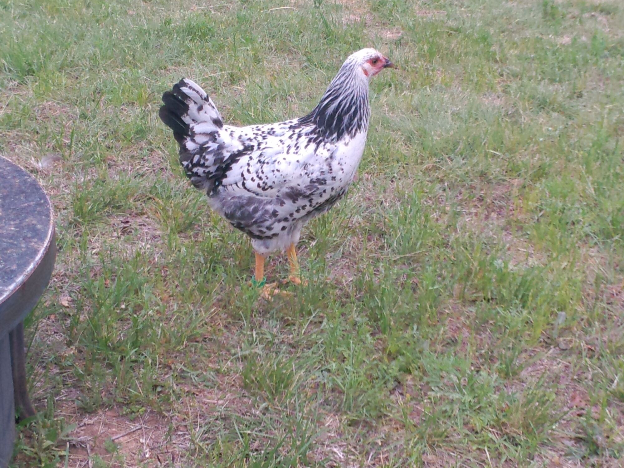 I can never get her to pose for me with her chest facing the camera. I wish I could. Her chest is solid white. The hackles are beautiful. The rest of her is black spangled white. She's truly growing out to be the prettiest of our birds.....and, she's a complete and total mutt.