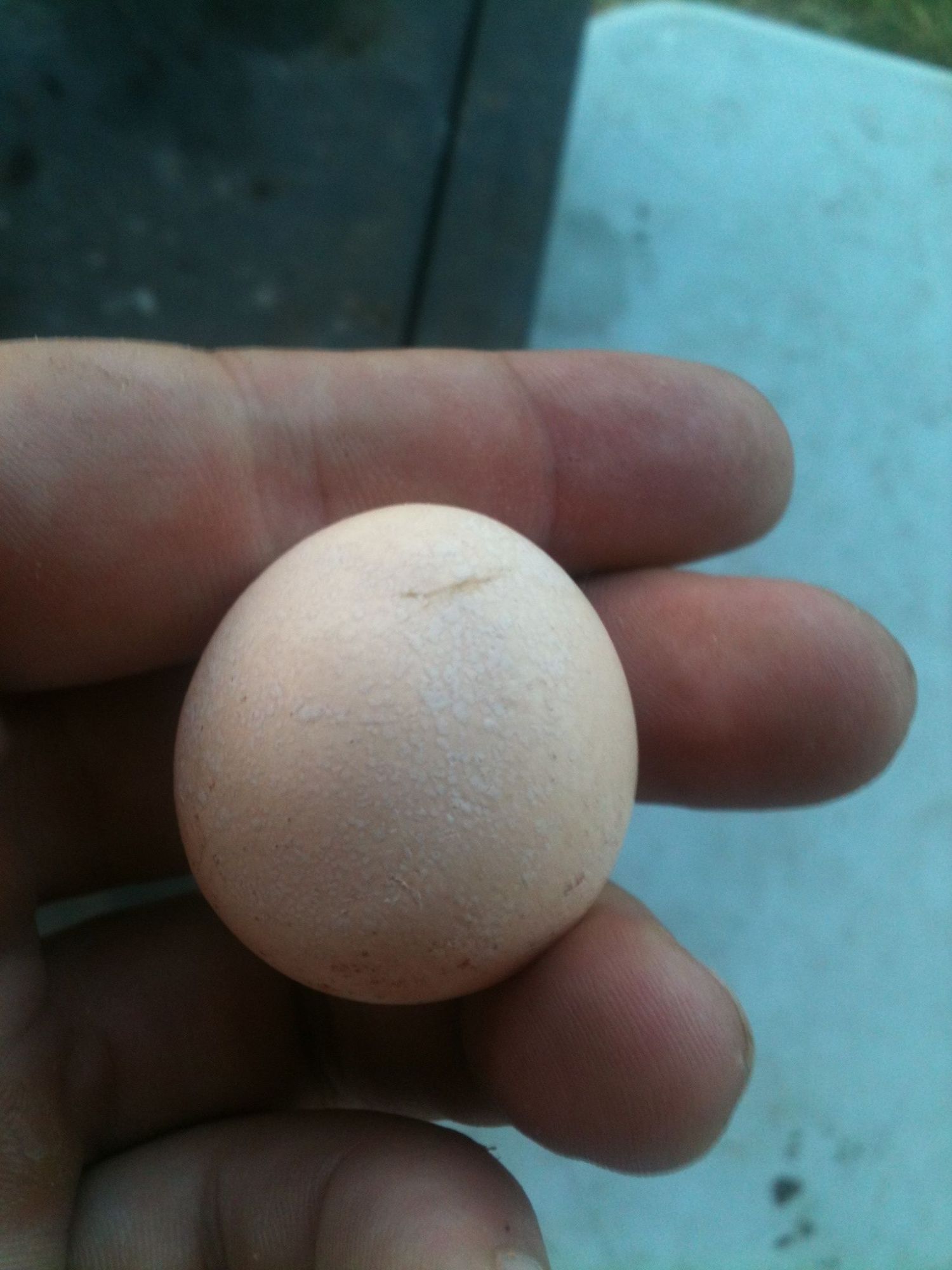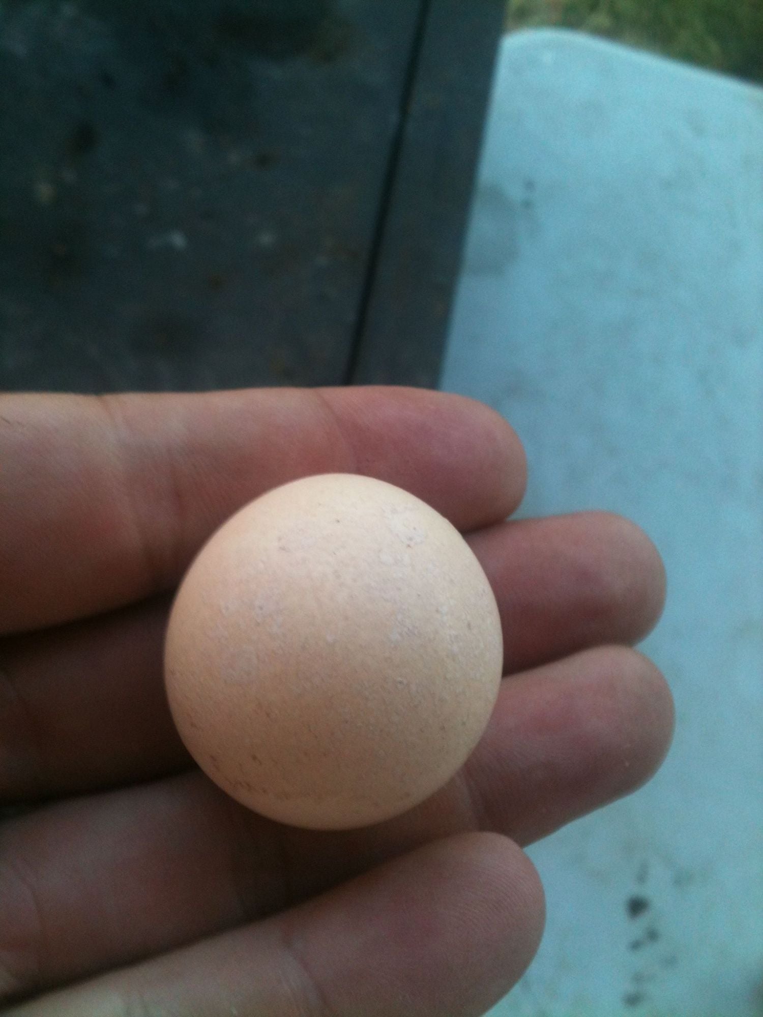 Ok.. I was just going to come on here and ask what would make chicken eggs so small! The ones I am "chicken" sitting have been giving normal sized eggs then tonight there was one about 1/3 of the size! I can't see deformity on ours but in the two months we have been watching them, this is a first here.. no guineas here either! Totally can't wait to see what the experts say!