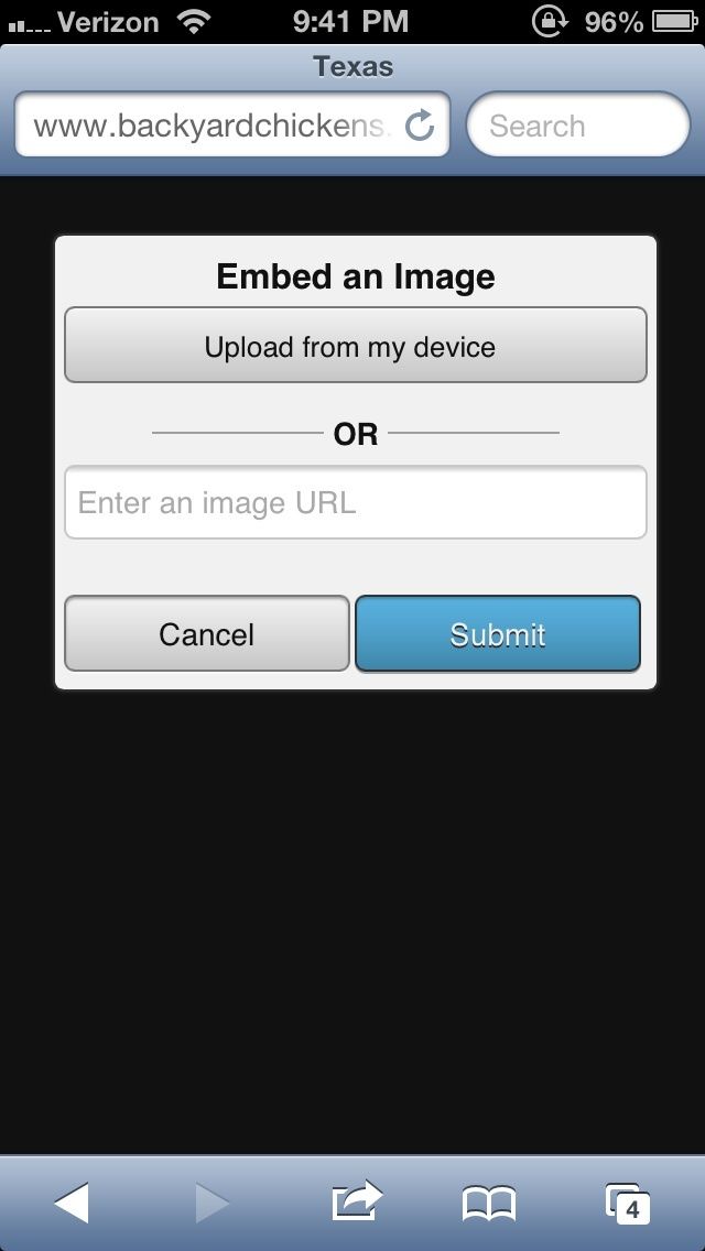 Sorry to backtrack, but a few pages ago someone was talking about adding pics to the site from their phone? How are you guys doing this? When I click the Photo button in the posting area, it asked me for a URL...? I have an iPhone 4...
