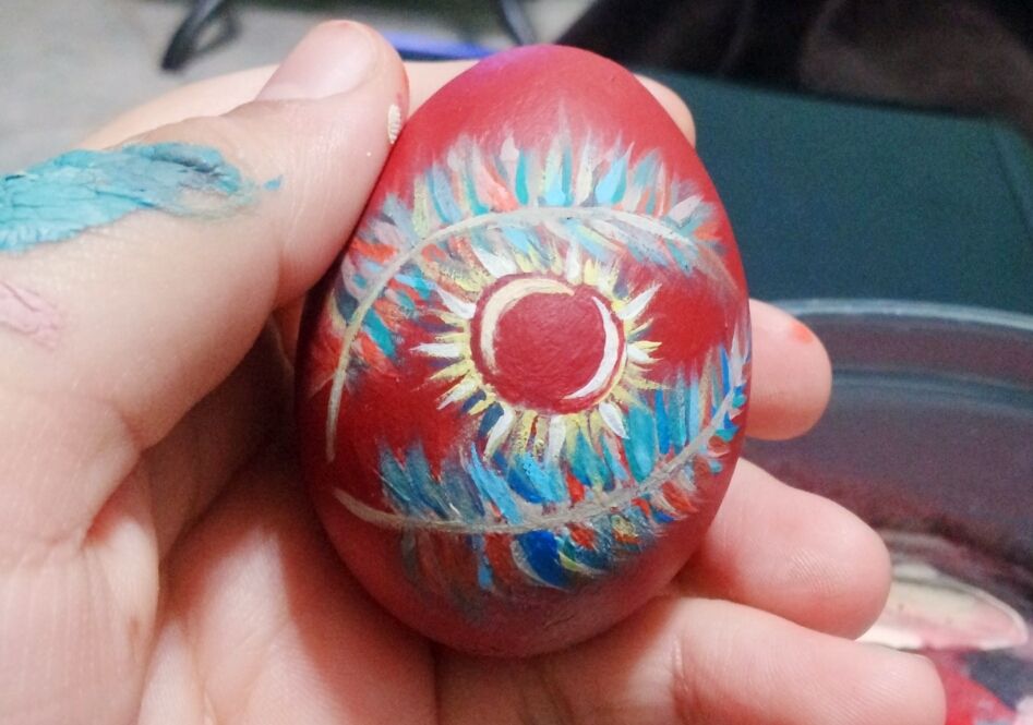 For example, these. The two on the far right and left are the ones I did with ideas. The one on the right was based on Little Red Riding Hood and the other was just me practicing mixing colors on the egg. These were really fun and I've gifted one of them and the other is kinda my baby, since it was the first egg I painted.