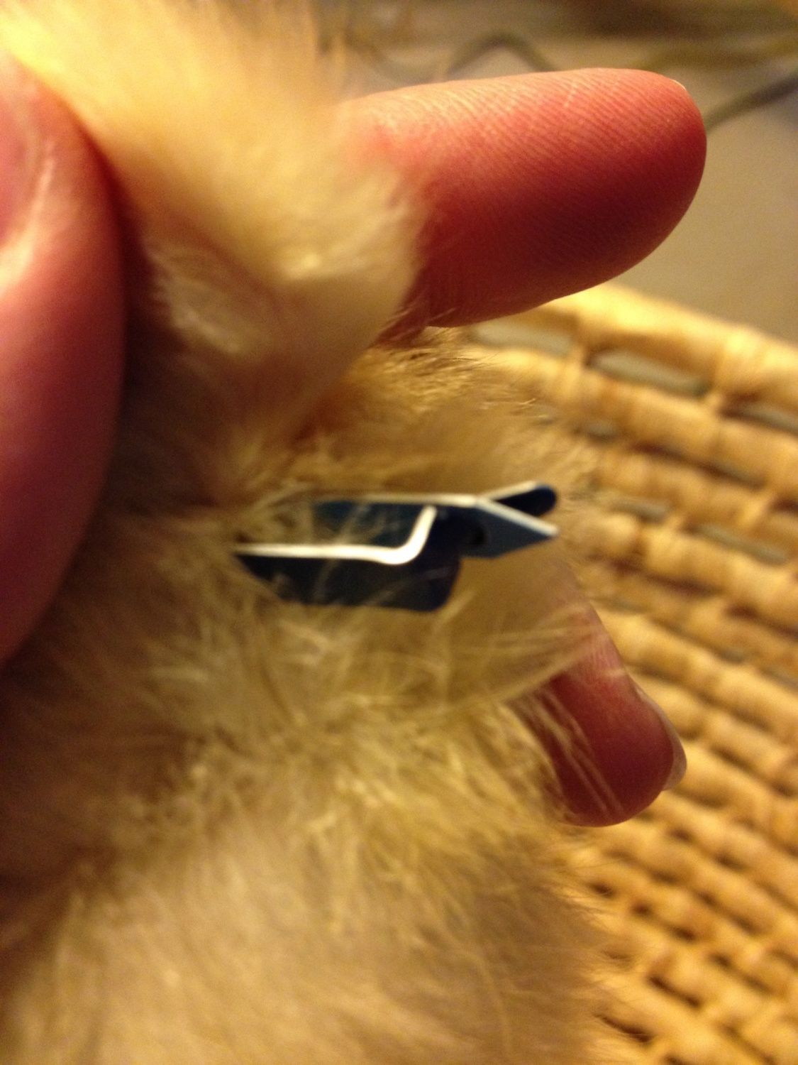 Just finished taking them out of the new chicks I picked up at Atwoods. My DH held them while I cut the metal and then pried them loose from their skin and pulled them back out. I was so afraid I would twist their wing too much and break it. Just glad it's over and done with.
