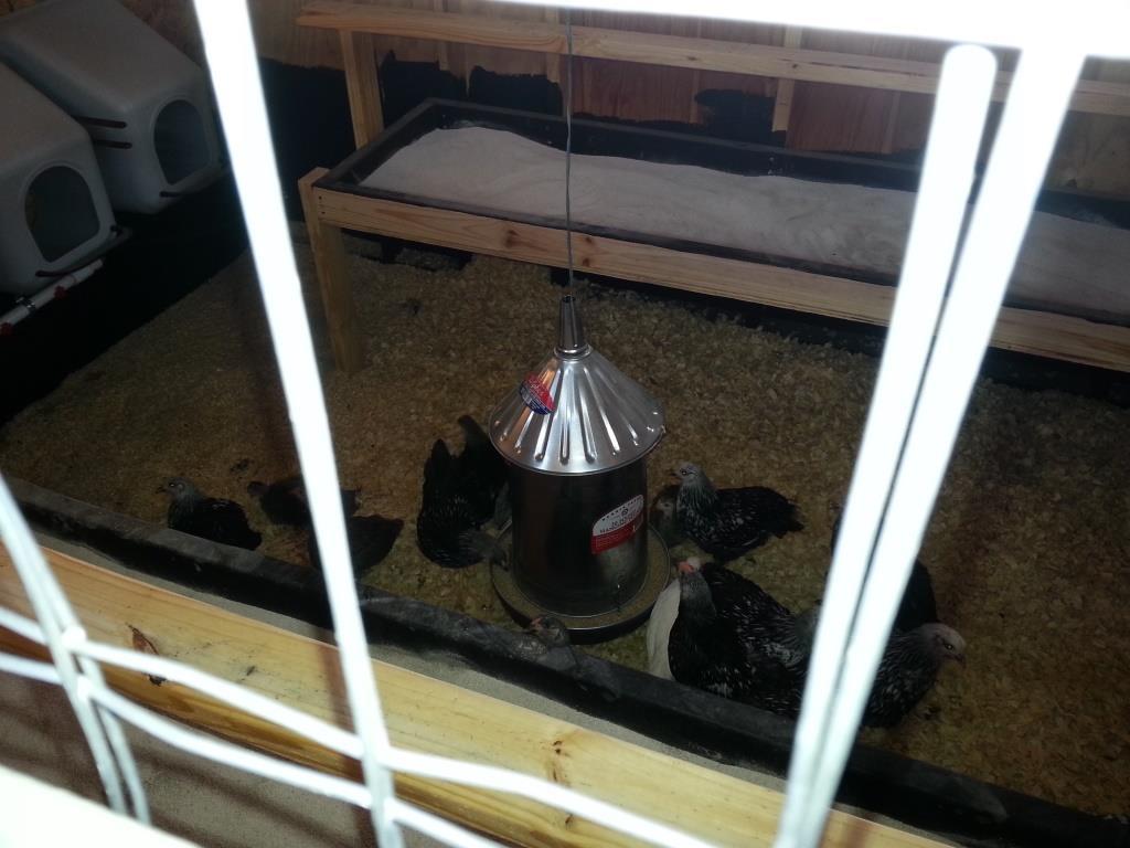 Okay, so I did it. I moved them from the brooder in the garage to the coop. When they first got in there they stayed huddled together like the boogey monster was going to jump out at any minute. I took the advice of one of the members on here and purchased the 3 gallon metal hanging feeder from TSC. The top was open, so I also bought a large funnel to serve as a top and also keep the birds from sitting up there and pooping in the feed. I hung it with some barbless fence wire. Here is a shot of the PVC\Chicken nipple auto-watering system. There is a black hose that goes out to the right that you can barely see. It connects to a 65 gallon rainwater barrel. I started filling the barrel with water and found a pin hole about halfway up. Not sure if I should try to fix it or return it and try another one. I'm thinking return, but danggit Sam's Club is like 28 miles away! I concerned about the chickens figuring out how to use the chicken nipples. I put them in the coop around 5pm and still have not seen one bird try the waterer. Yes....this is me checking on them every 30 minutes or so. First night without a night light and outside on their own!!! I'm kinda a nervous wreck, LOL!