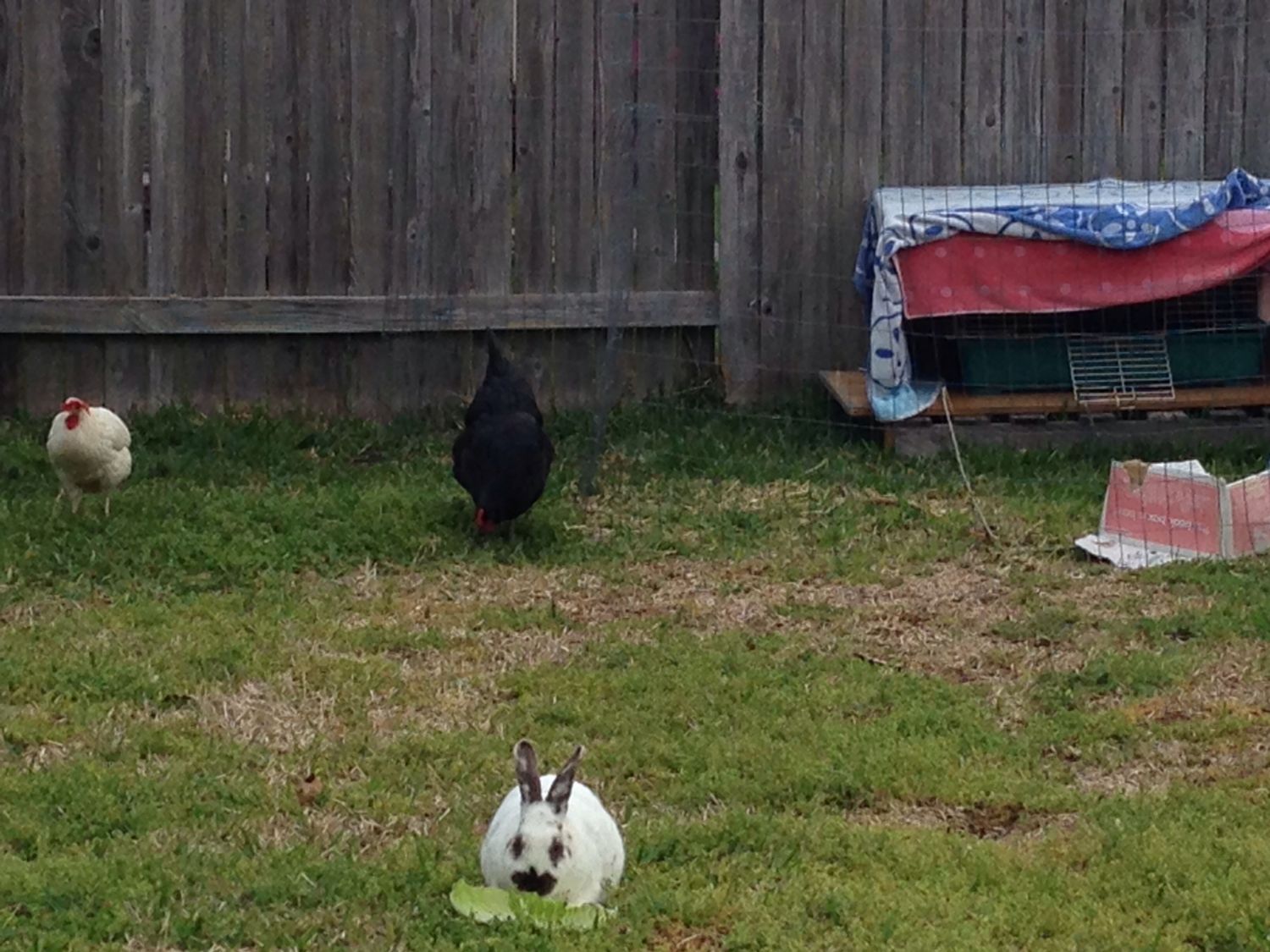 This is Peter who has, once again, escaped his living quarters. You may not be able to tell but that's his house in the background. Smallish house, it's just for the rainy days and to get out of the sun, and nice sized run. He's figured out how to unhitch the fence from the nail on the wood fence. Today's project...