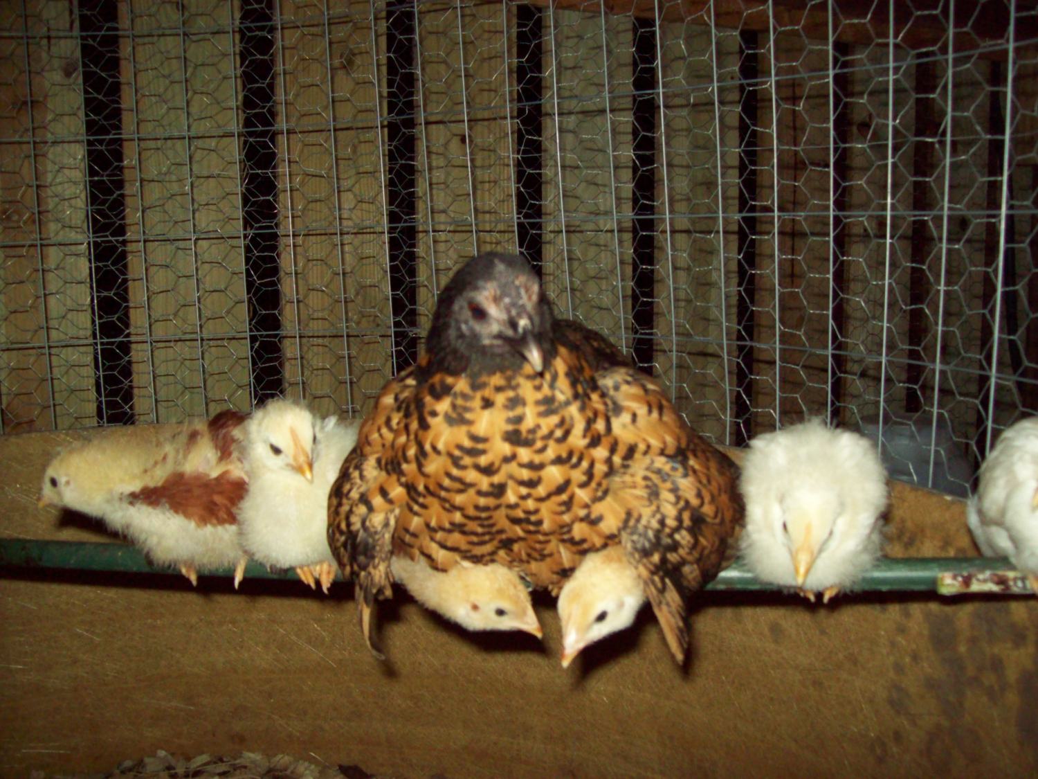 starfire the black and white ones are silver campines they are from spain and make 4 lbs hens and 6 lbs cocks they are flighty and busy great foragers lay large white eggs. these have matured quickly they are 11 or 12 weeks now and the little cockerels have been crowing since 5 weeks or so. :) btw i still say you should find a heritage rhode island red cock bird the most docile you will run with your hens safe for small children and pets .