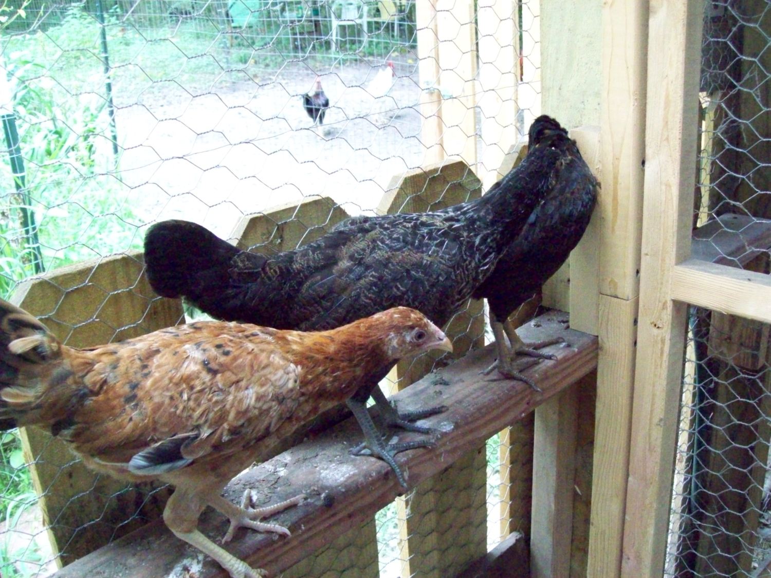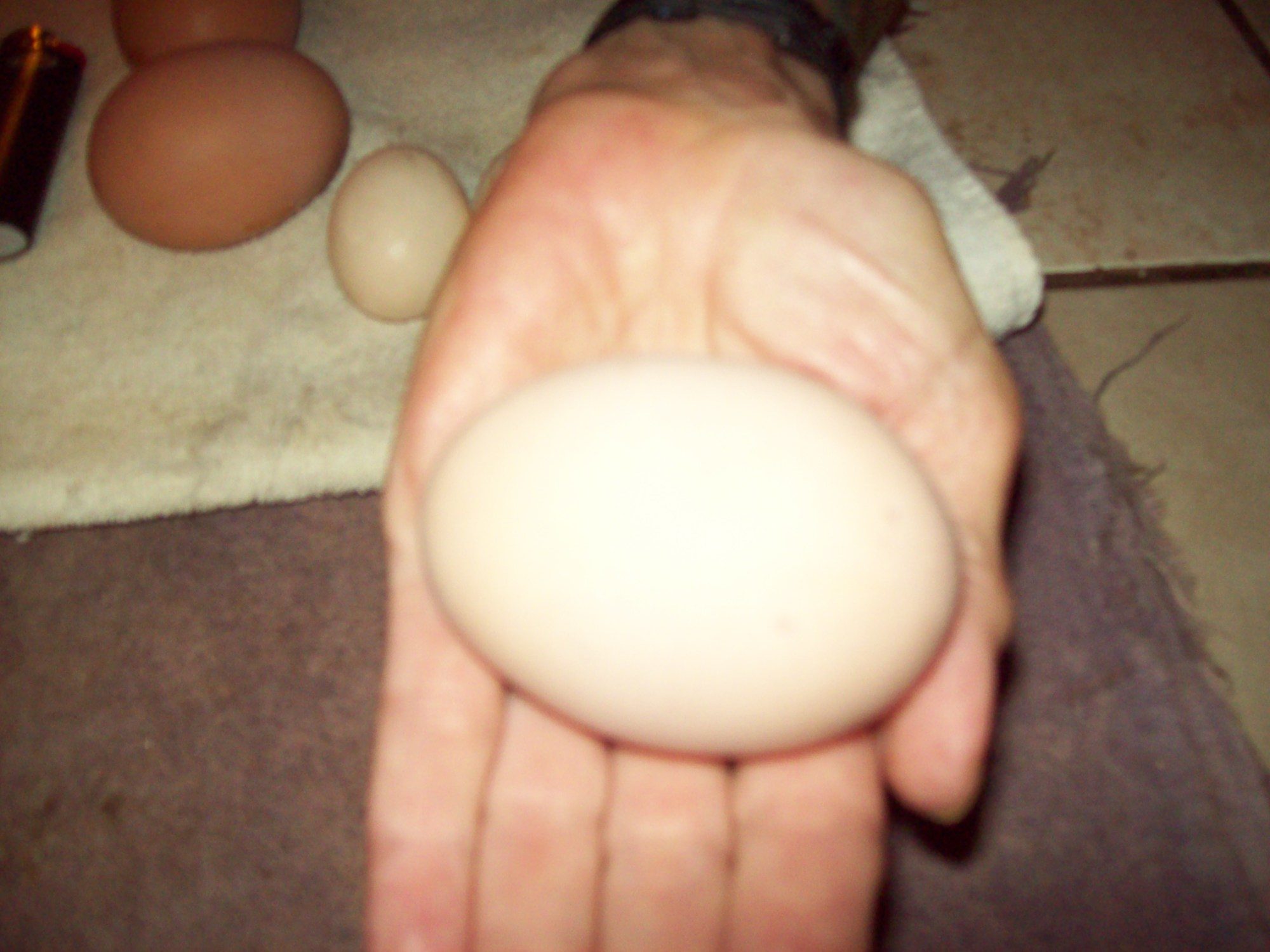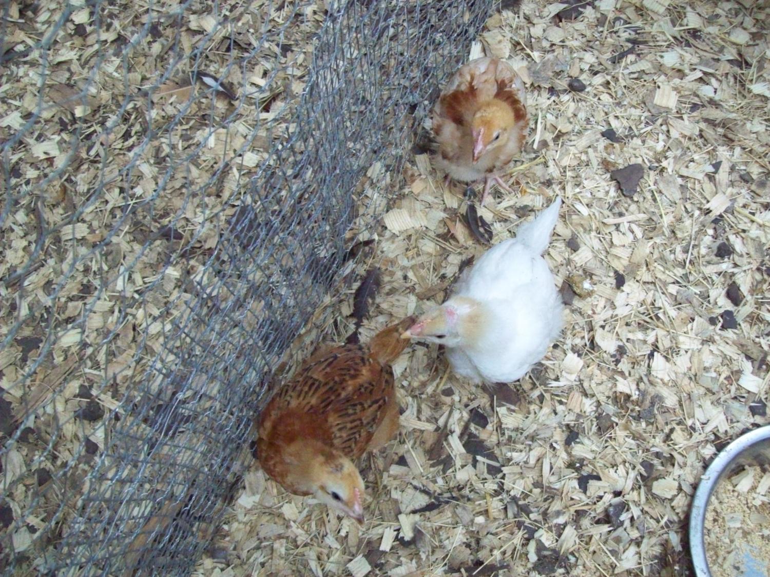 These are our last hatch...June 30th the little white one is the one the broody Belle tried to kill...still has a bald spot on it's head.