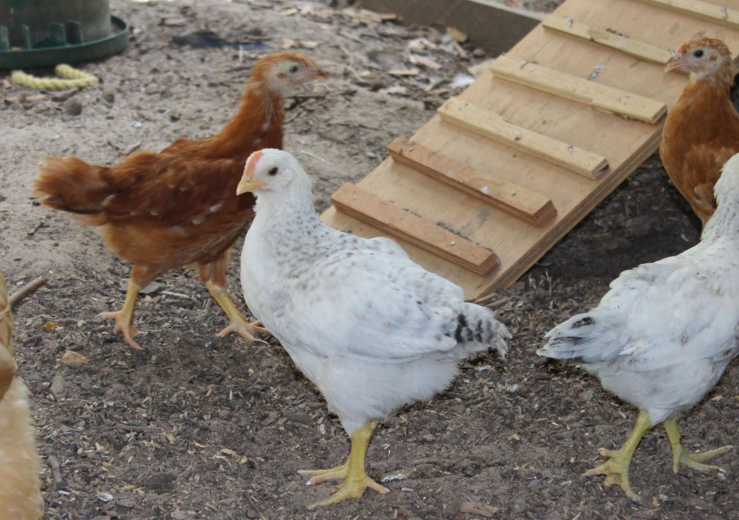 I have a group of 5 week old chicks, supposed to be 6 Delawares and 6 New Hampshire pullets and 1 New Hampshire cockerel. I'm getting a suspicion that one of the Delaware pullets is a cockerel. Anyone here have experience with the breed? These are my first Delawares,so I'm not completely sure. The NH cockerel is glaringly obvious already. and the NH boy. He's quite a character. My nephew wants to name him Al Capone!