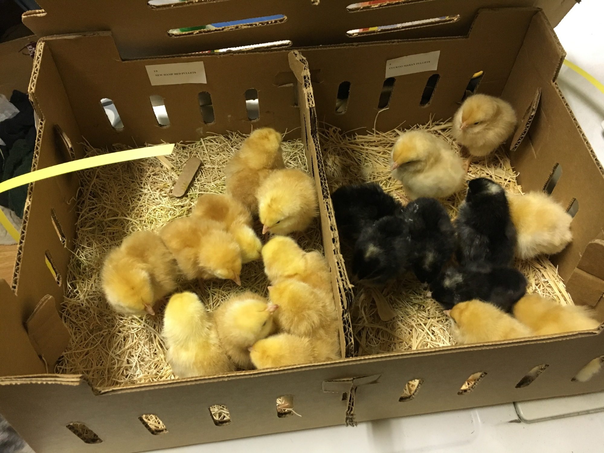 Ideal Poultry emailed me last night that my new chicks were shipped and the Post Office in Cypress called at 5:45 this morning to let us know they had arrived! I love going up to that window in the PO building and hearing those peepers going loud as they bring the box up to me. The whole office turns to stare. I got 20 total: 10 New Hampshires, 5 Buff Orpingtons and 5 Copper Marans (for dark brown eggs). Liveliest bunch I think I've ever seen. As soon as they had their first drink, they were hauling tiny butt all over the coop. My remaining large hens have been kicked out of the main coop into the side stall-coop and we took out the roosts and fenced in a section for the new peeps. The hens can walk right by them and look as they go outside.
