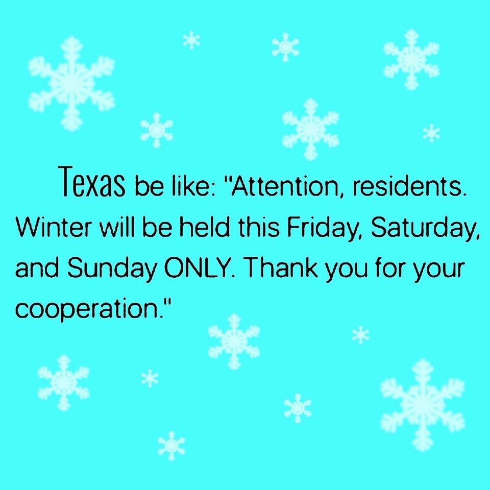 But since moving to Texas, no. We've never had snow here. It's never been recorded.