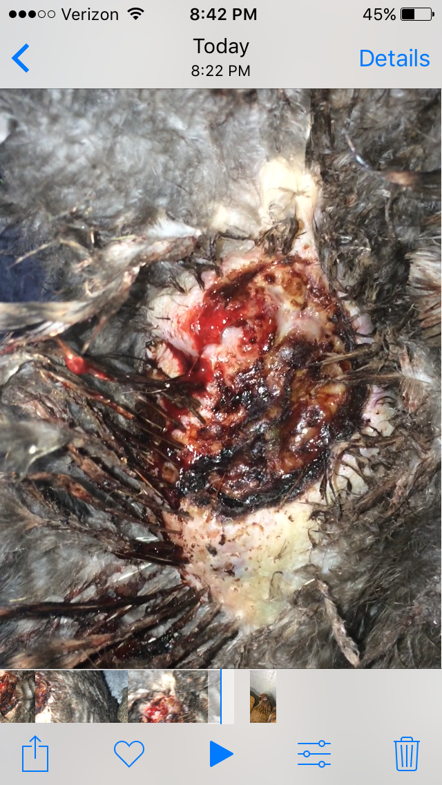 Thank you, I'm hoping someone will be able to help guide me on what to do, I feel like there's 20 different directions I can/should/could go. We've never had anything like this happen. At first I thought the egg decline was protest about the new nesting boxes but obviously that wasn't the case. When I first noticed the spots on vents I thought parasites but I've gone out with a flashlight at night and watch and checked everyone and I've never seen anything. I'm worried about treating the area this weekend (which was my game plan) with anything that might irritate their injuries and make them feel worse. :(
