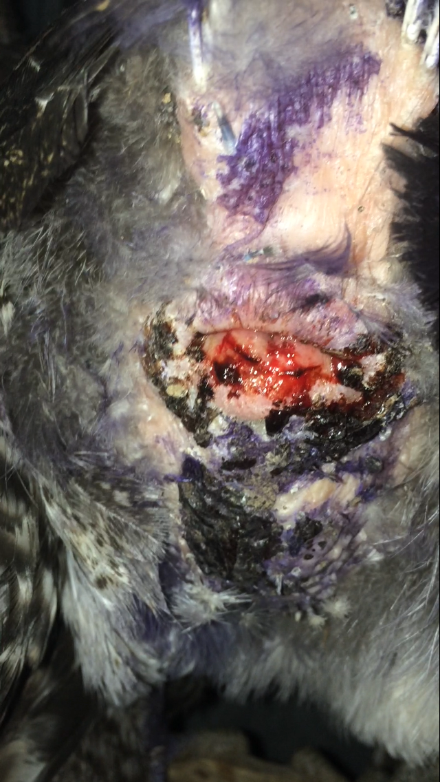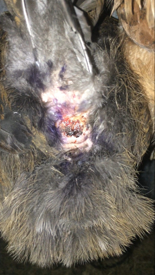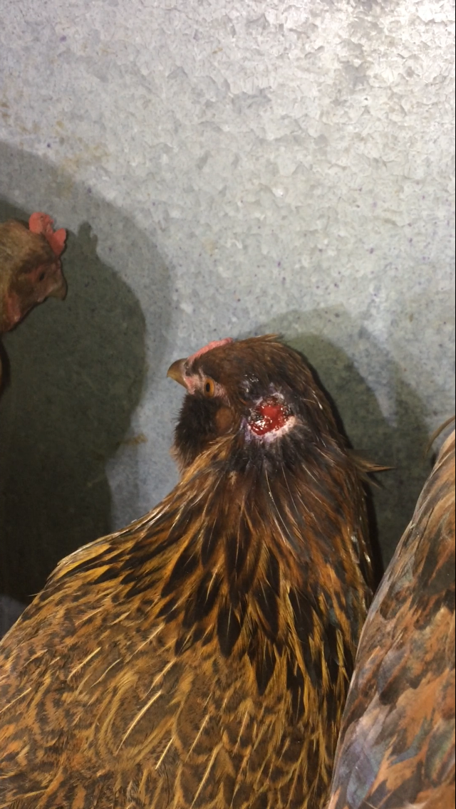 Is the head injury possibly from the rooster but the vents from something else or are the two related? (She could possibly have injured herself by some wire we have around the bottom to keep them from sticking their heads out and dogs getting them).