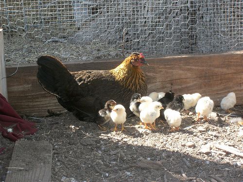 One of our AG pullets that roosts in the trees came walking through the horse pen with 16 little peeps in tow & a horse fixing to squish them :( We herded them into the backyard & into a pen