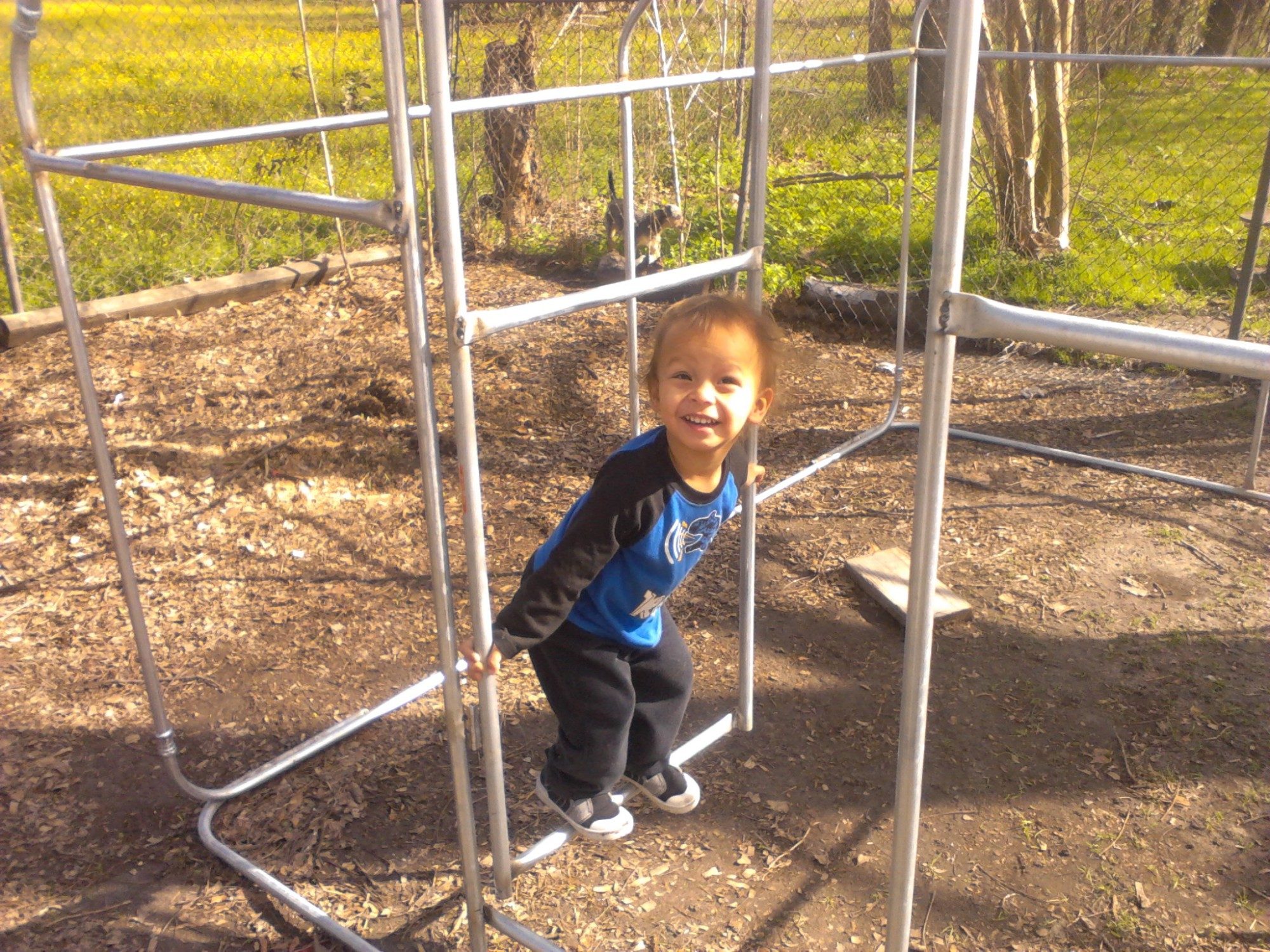 Got the Texas Sized Chicken Tractor framed up...Elvis is checking the hinges on the door for me, to see if they are welded on properly. lol Now gonna go find a couple of their old ride-on toys to rob some wheels off of.