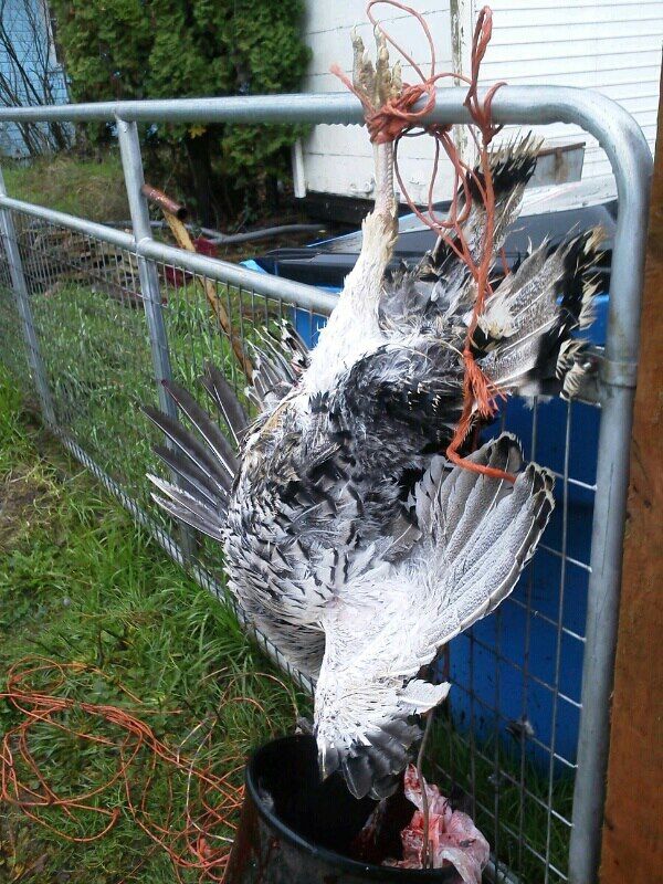 kuntrygirl : try the bag! It really worked very well. If you don't have a bag, we had been considering duck tape to wrap around the wings and body because we thought it would hold better than string to keep them from flapping. Then I was just going to remove it before scalding, as it would not matter if it ripped out feathers after the deed.