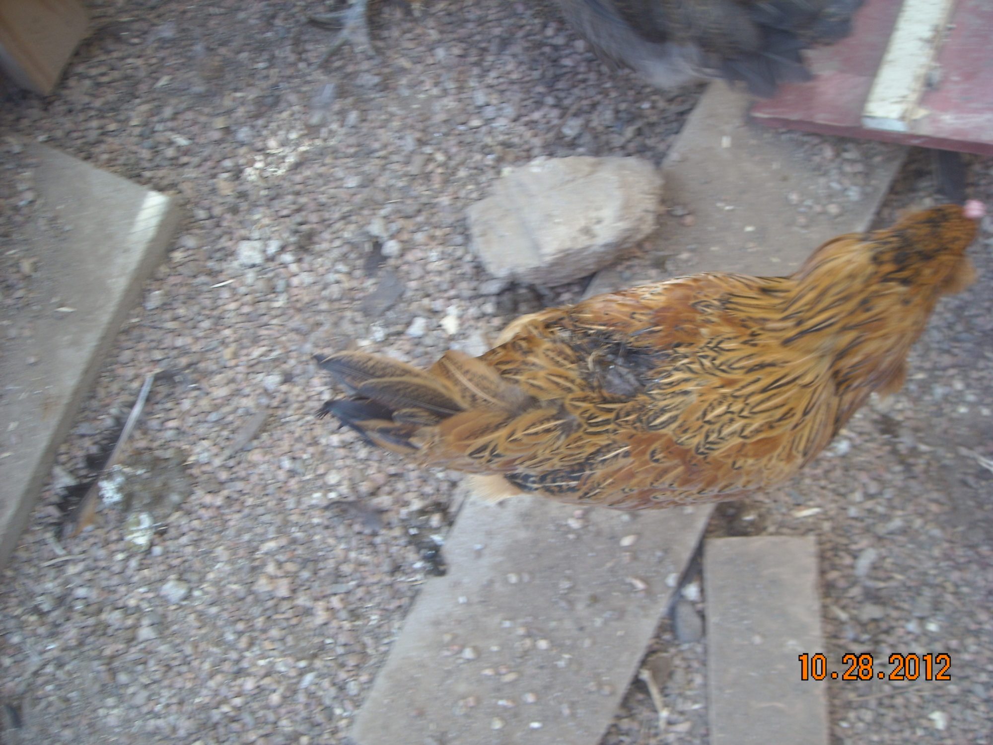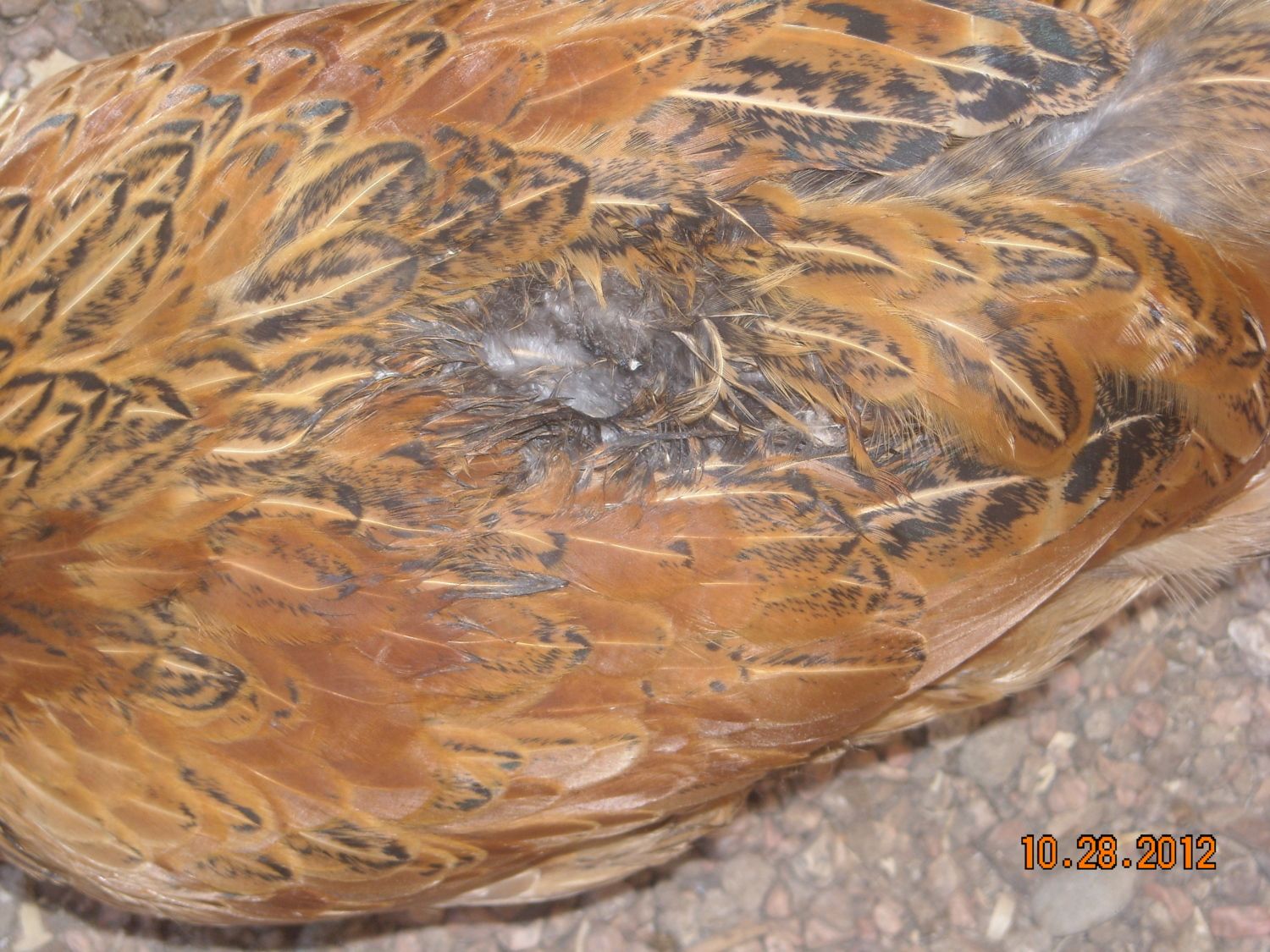 Hello, I am a new backyard chicken owner. I have 4 EE's that have been laying since late July, They are mixed with 1RR,1 Australorp, 1 Barnvelder and 1 Golden Buff that are about 14 weeks old. They are eating Purina's flock raiser with free choice oyster shells and about one handfull of scratch each day. I let them freerange in the backyard for about an hour every other day. It has just dropped below freezing at night for a couple of days. Today I noticed that the smallest of the EE's has something wrong. Behind and under her wing it looks wet and almost like mange. As I was watching her she pecked at it a little bit and one of the other EE's pecked at it a little. I don's see any blood. They have plenty of room the coop is 4x8 and the run is 8x10. Any Ideas on what it is / what I need to do. Thanks.