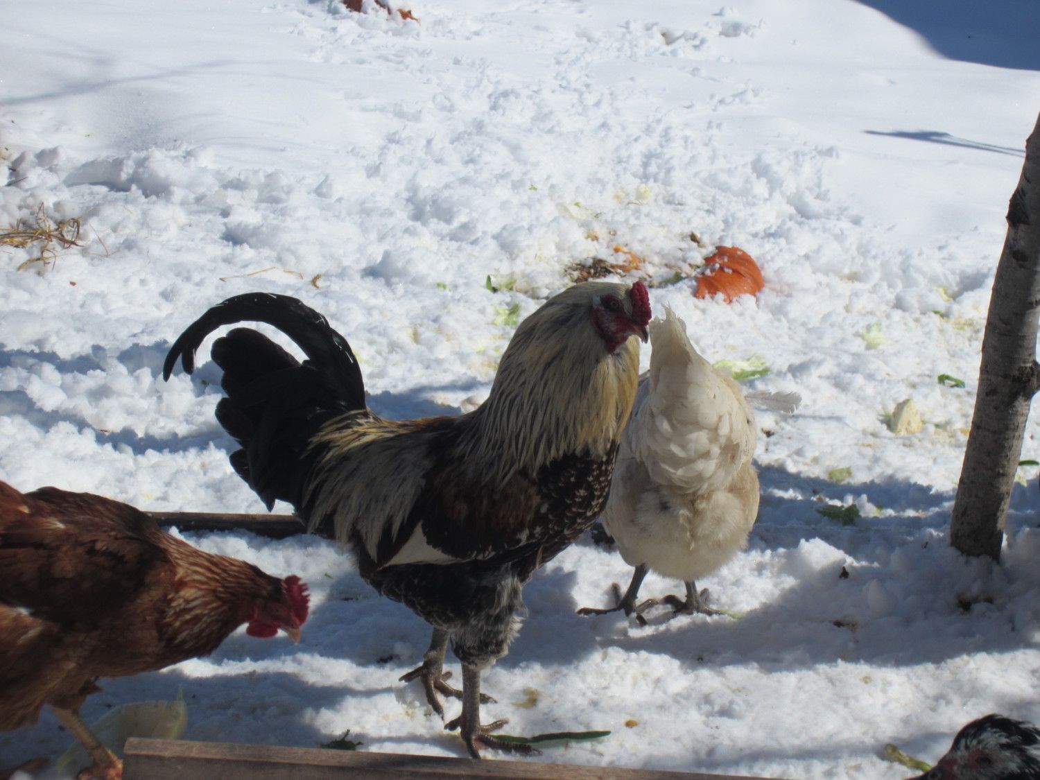 Secondary two roosters: Freedom Ranger rooster (Big Boy raised by Daisy in July 2012) ; Golden-Laced Wyandotte - these were in the 'chicken tractor' with a few Red Stars, one Freedom Ranger pullet all week; a few days later, I added 2 RIW, 1 Blue Andalusian/Red Star pullet, 1 Dominque