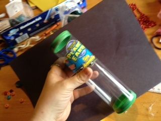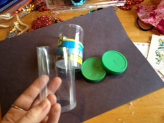 From the pile I used an empty plastic tube that my son got little animals in, an old plastic "gumball machine" toy that seemed "mirror'ish" shiny, some twix wrappers (yes I found it in his messy box **rolls eyes**, but it was shiny and I figured I might make use of it), and some aluminum foil.