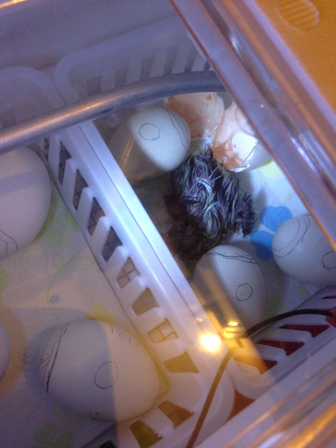 on day 14 I candled eggs and accidently broke one(craked the shell at the top), in an effort to save the developing chick, I dampened a piece of paper towel and smoothed it over the egg, in the bator the paper towel dried slightly and stuck to the egg nicely. today day 23. the egg finally hatched and a healthy baby cochin is now chirpping away in the bator