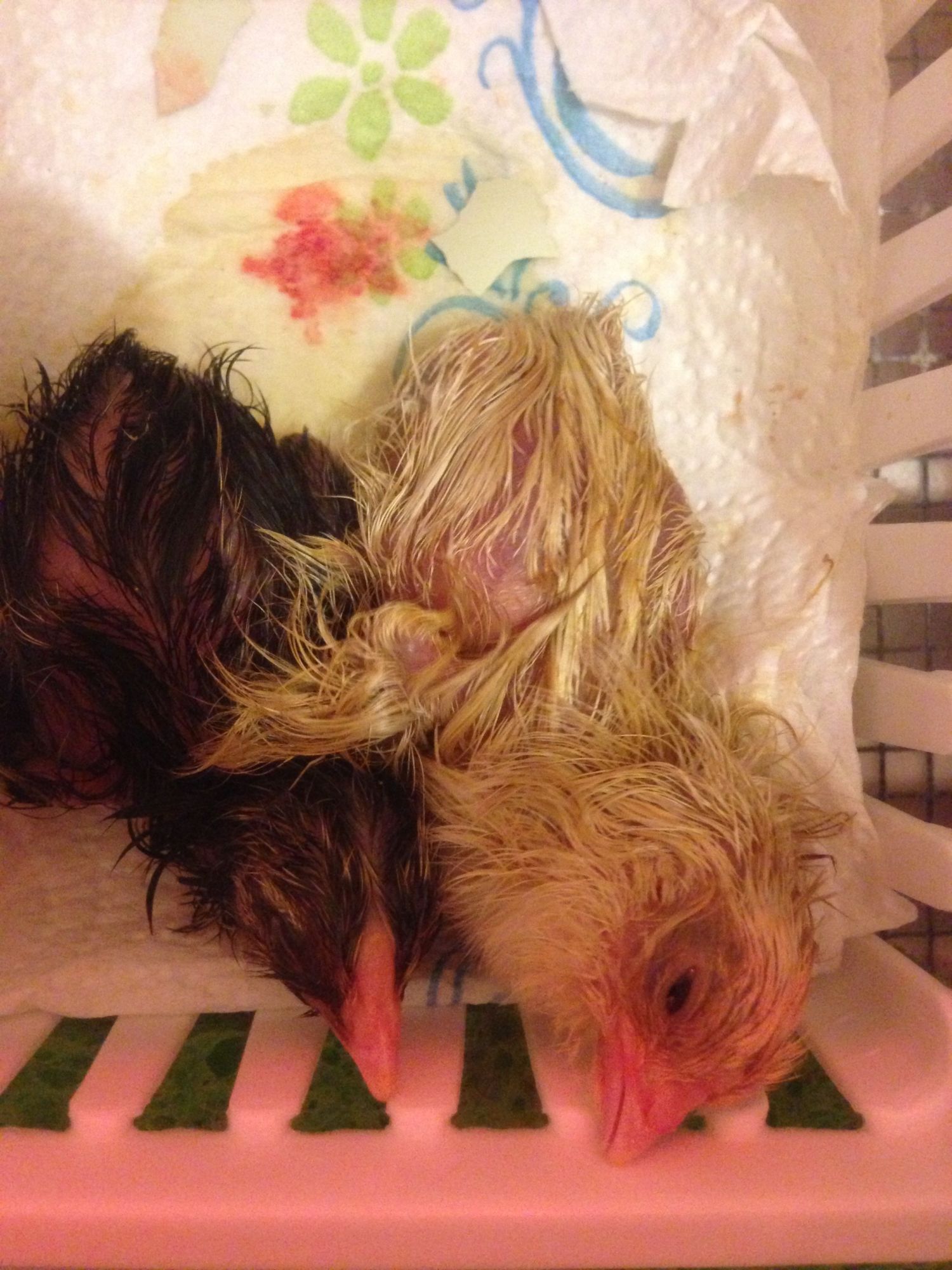 Got two from the assist.... One did the job herself after I made an external pip for her.... Took her all night to zip. She's got that tilty head back thing. I started giving her sugar water and will buy vitamins later. I couldn't find where the beak was in the Araucana egg...it passed sometime in the last two hours as I was stupidly waiting to see if it would turn at all.....![]()