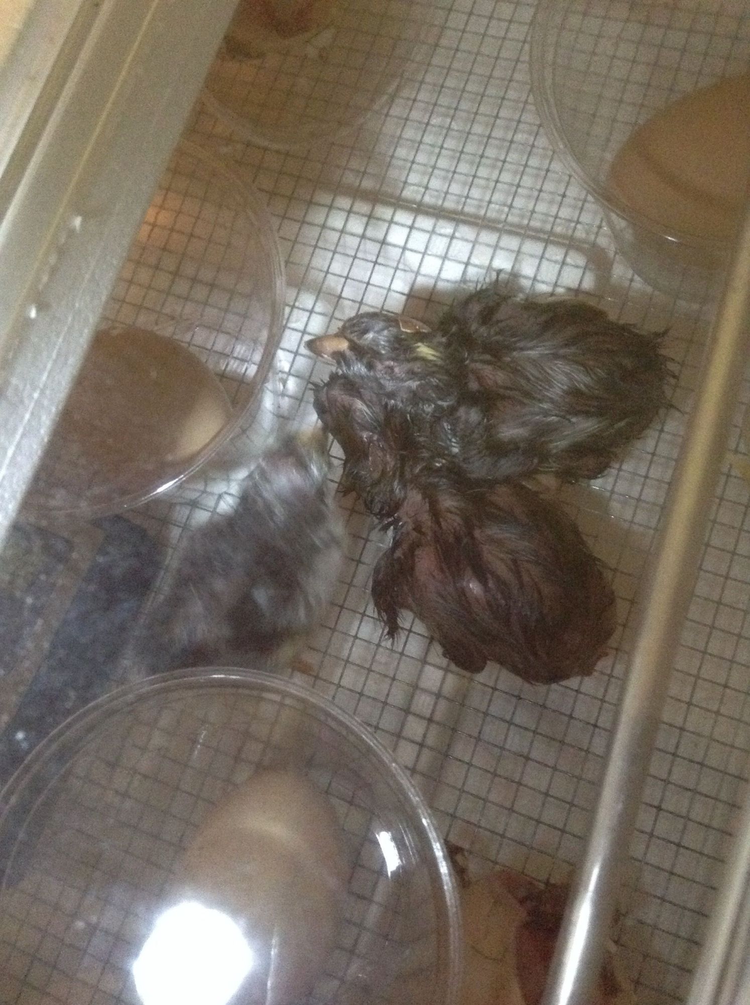 I have 4 hatched already. They were supposed to hatch on Easter. Silly chicks! Here they are: