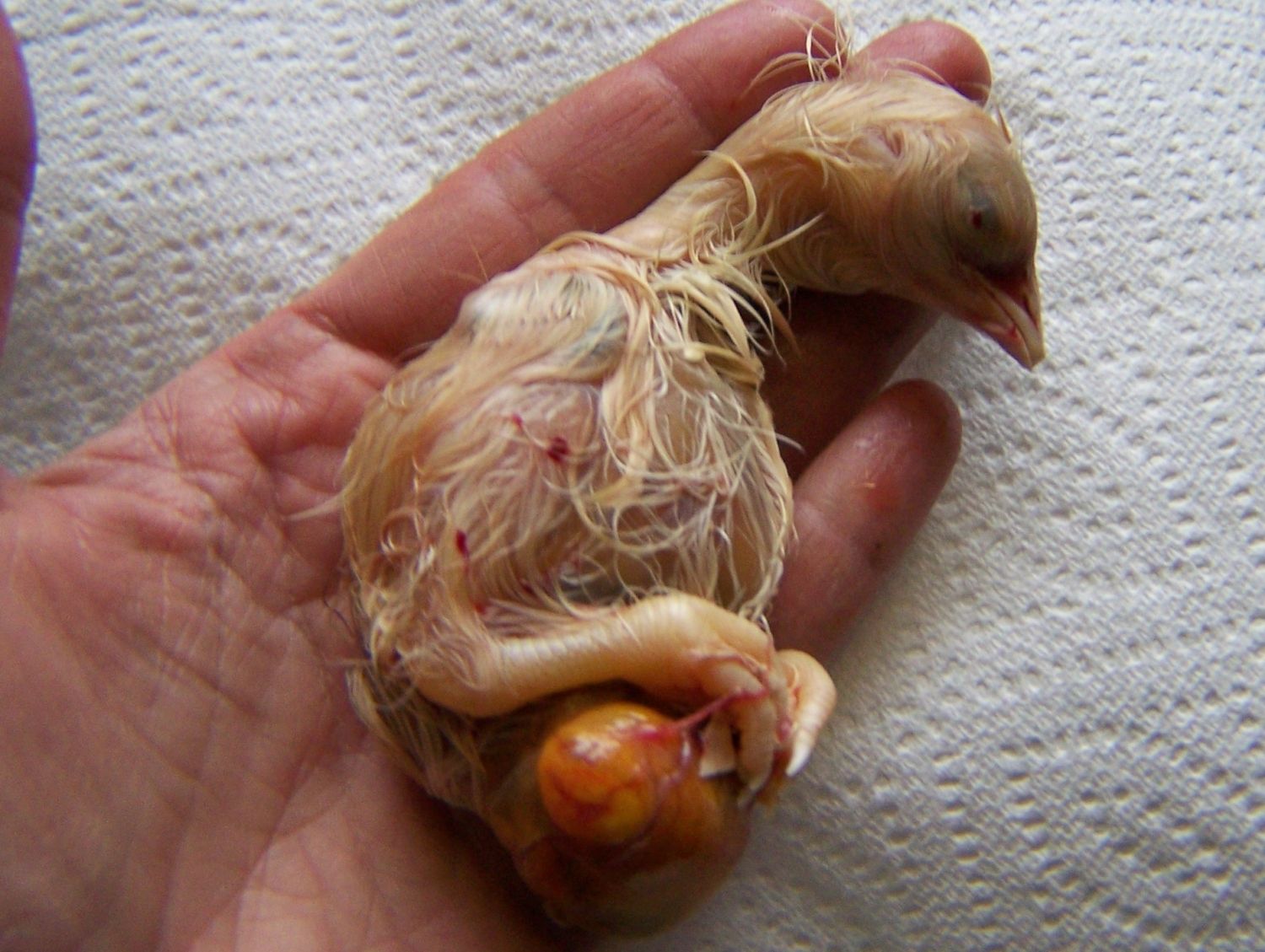 While I was pulling babies out of the bator, I candled a couple of eggs...when I put my LF eggs into lockdown with the rest, their air cells hadn't drawn down yet, so I had no idea which end should be facing up. One of the three I candled had pipped upside down, and there was dried blood on the spot. When I candled it, there was no movement. So I opened it up just a tad to be able to feel the chick, and it was warm but a bit stiff, and no movement when I poked. I went ahead and opened it all the way, and this is what I found: