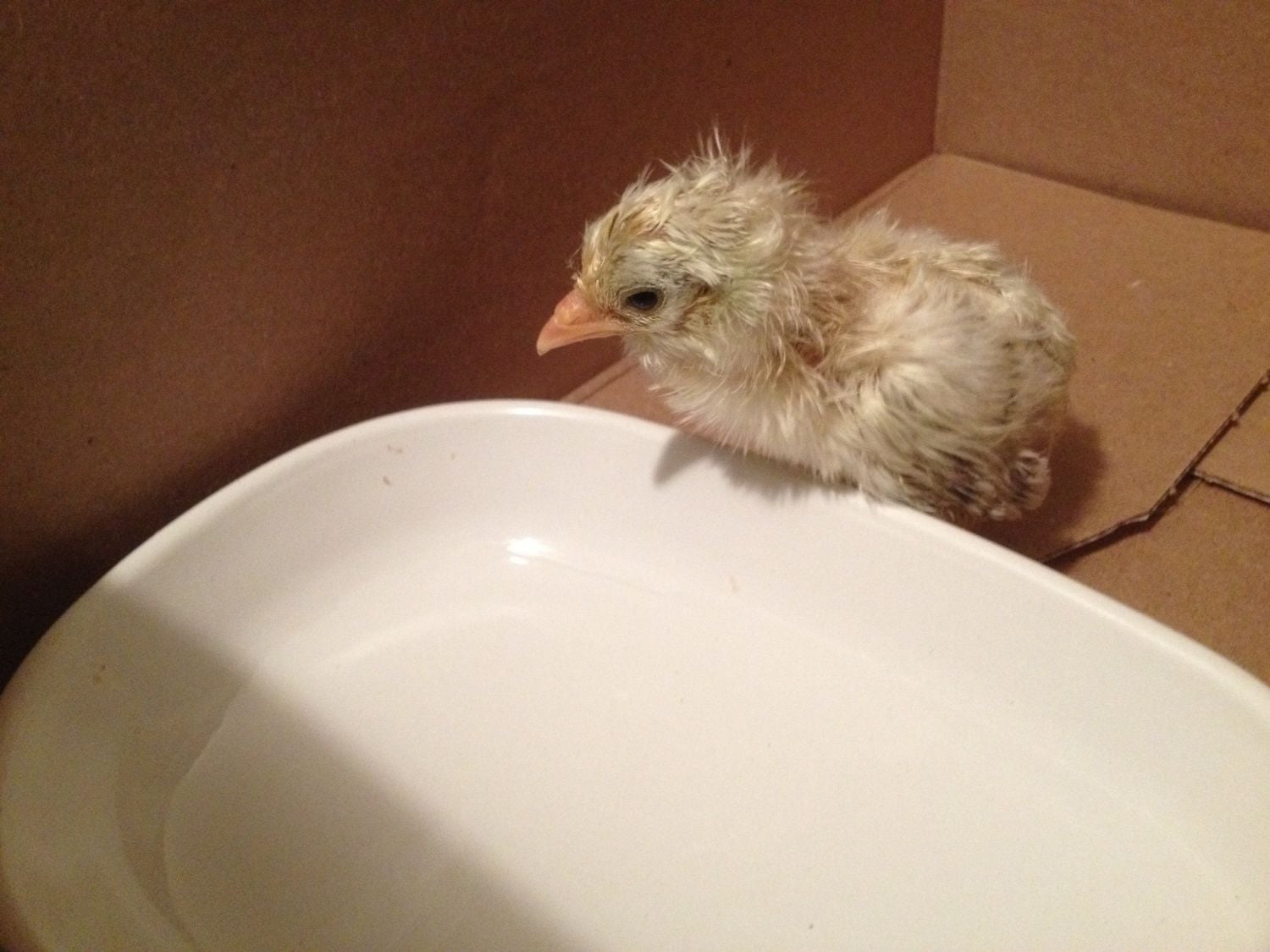 Quote:I use a chick water fountain with a quail bottom. The cannot drown in it.I don't mean to pick apart your setup, but some advise. That water dish is awfully big. Chicks can fall in and drown easily. I'd put a much smaller dish in with some rocks in it. And put some paper towels down on the bottom too. Cardboard is slick and can cause leg issues.