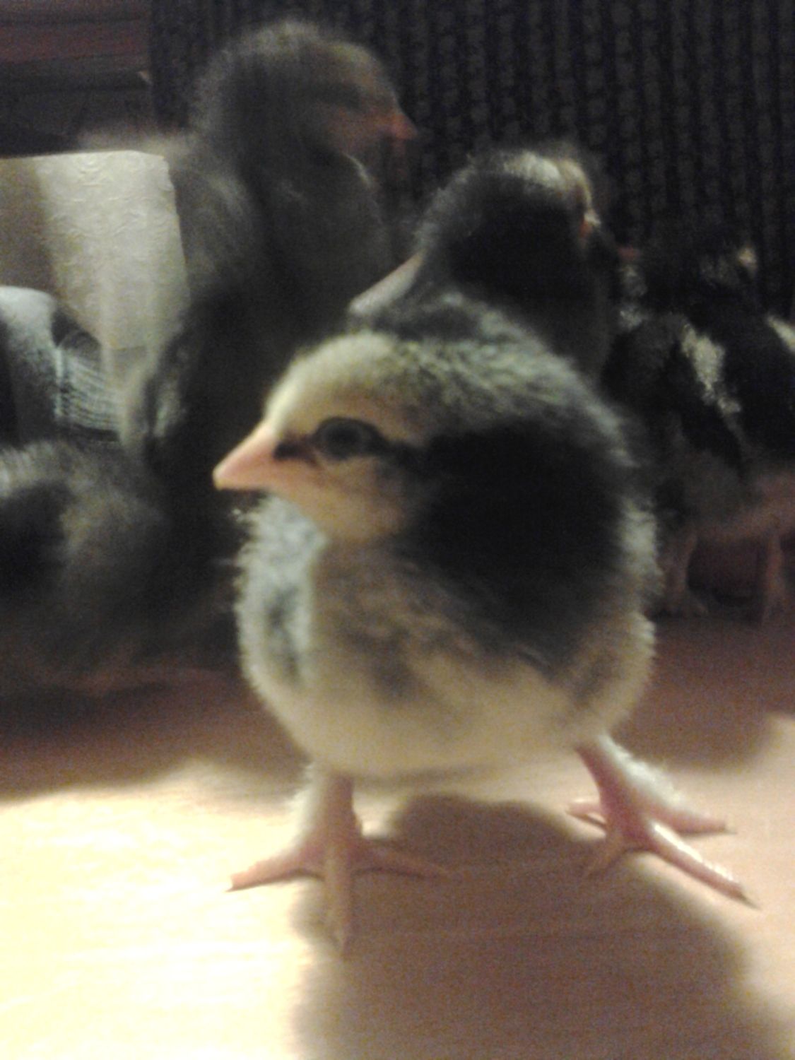 I put her in a small cup at first, with a paper towel, and where the light could shine..almost on her. She felt so cold in the legs and feet..and..duh, she isn't a silkie, no feathers on those legs or feet, must be a polish, has the top like some of the silkies with the vaulted heads. Nope, not a silkie.