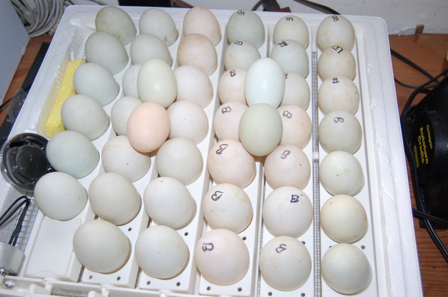 45 eggs. Mixture of Buff Ducks and Runner Ducks with a few misc barnyard mix chicken eggs until I candle and remove clears