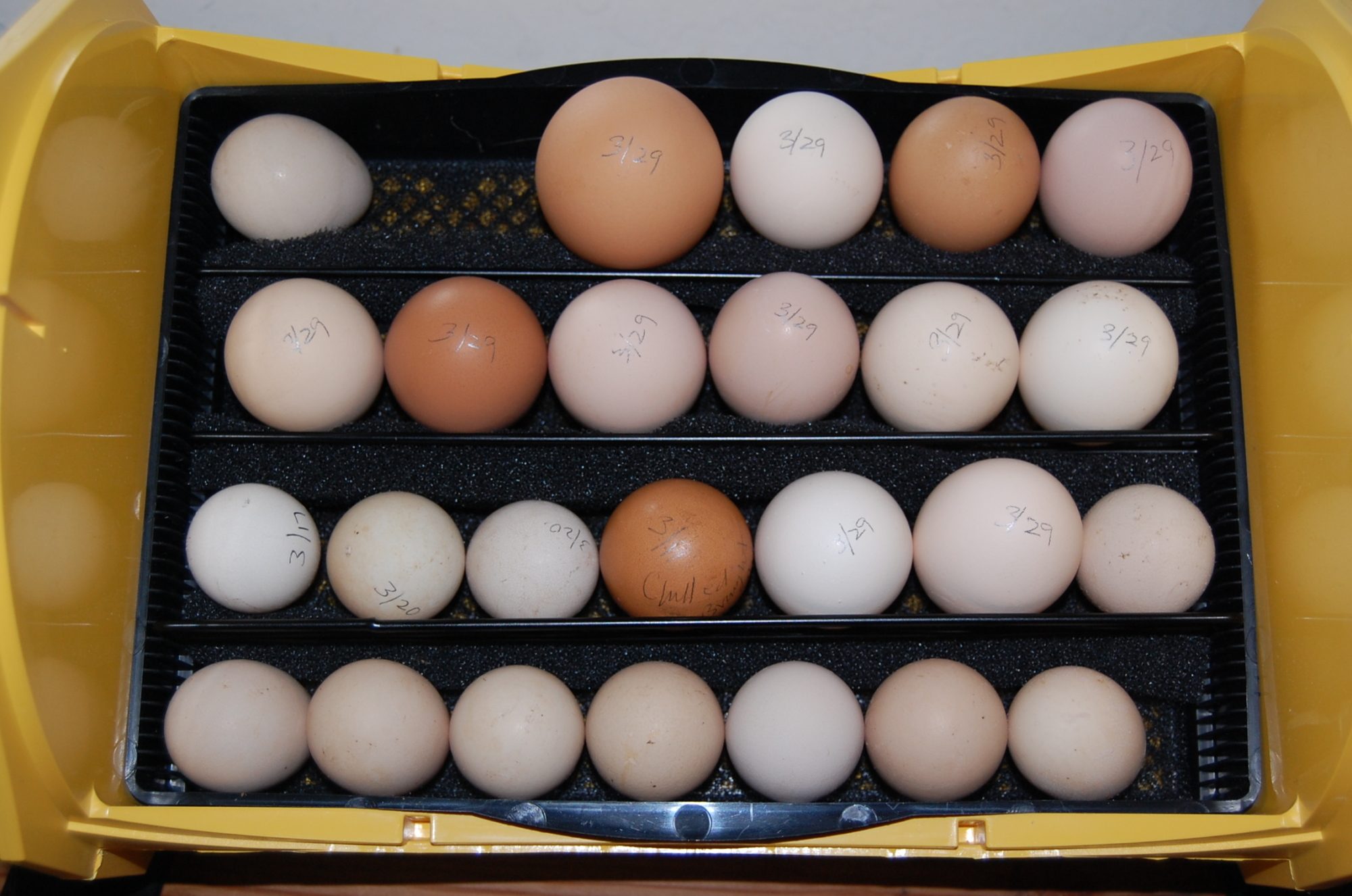 Mix of 12 guinea eggs, 12 "Meat bird" eggs qand 1 mixed chicken egg. Notice the one giant one? It came in the same