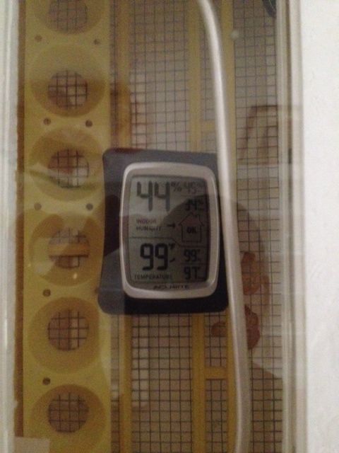 I live in nowhere land; I just tried finding a hydrometer/thermometer that would fit in the incubator. Everything the local stores carry is too big. I ordered a brinsea spot check off of amazon, but that won't be here until tuesday, and I got two different oral thermometers. They were reading within a half a degree of eachother when I checked them out, but now they're showing 2 degrees different in the incubator; 1 at 103, the other at 101. The probe that came with the incubator is reading about 98 and the built in is at 97. I just don't know what to do. I want to set the eggs, but I don't know what to trust, and I'm really getting frustrated with this whole thing. Why have a built in thermometer if it isn't going to be accurate? I wish my brinsea was working.