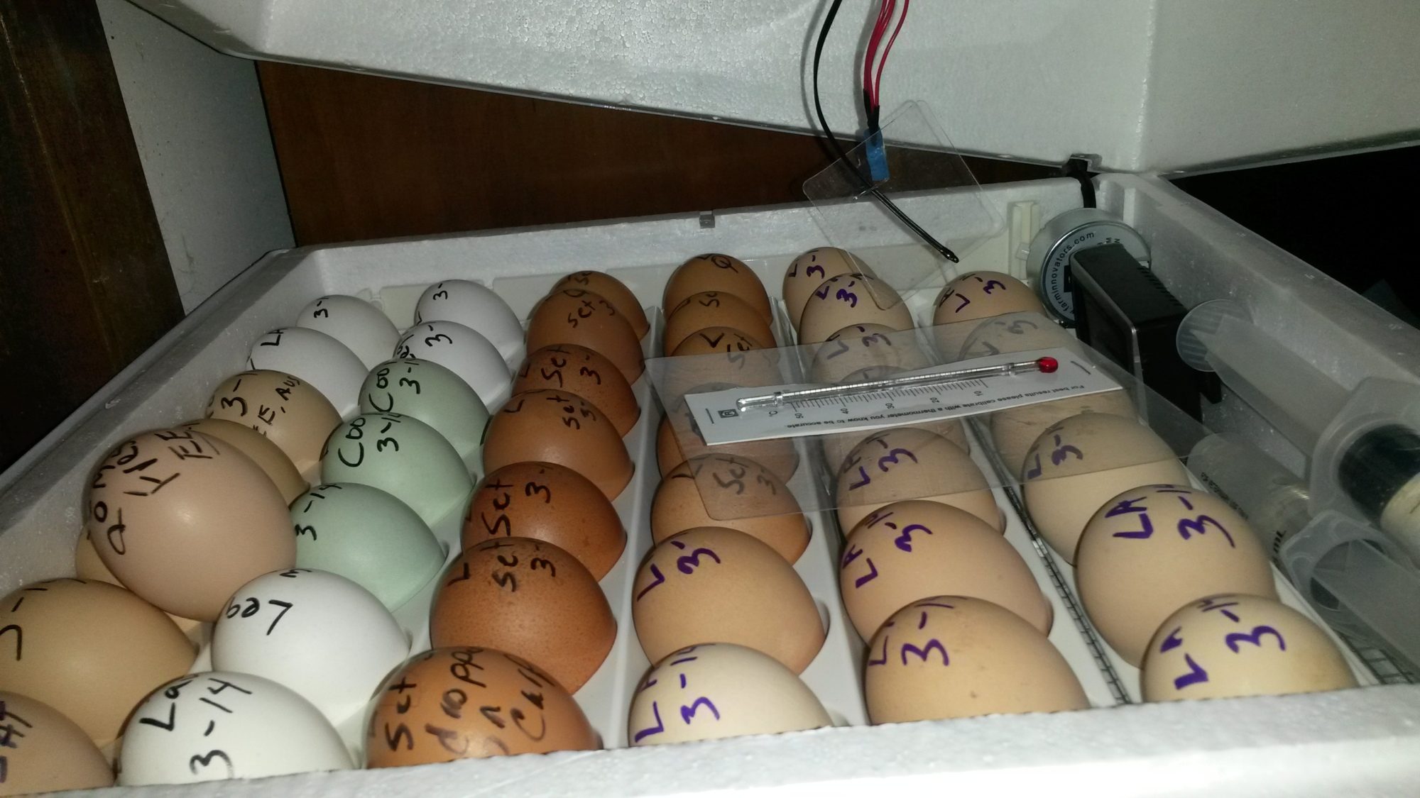I have one incubator set today with 21 Serama eggs(mine hatch around day 20) and another incubators set today with 26 eggs. 47 eggs in incubators and my little serama hen Athena went broody today to join us. She is setting on 5 eggs. So that is 52 eggs total! This will be the best Easter ever!