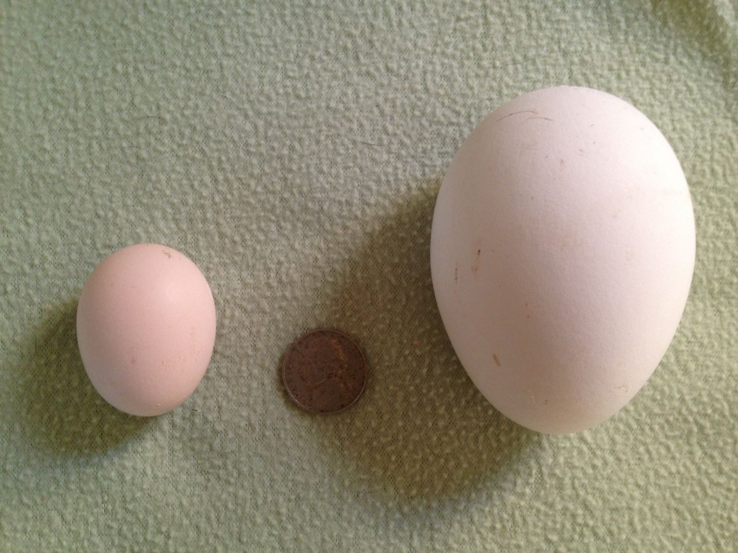 Biggest egg of the day on the right, a Pilgrim goose egg. Littlest egg of the day on the left, have no idea!! Maybe a bantie, I have one little bantie hen but her eggs are usually a little bigger. Could be a first pullet egg from an Iowa Blue, there was one sitting on it. Smallest egg I've ever found!!