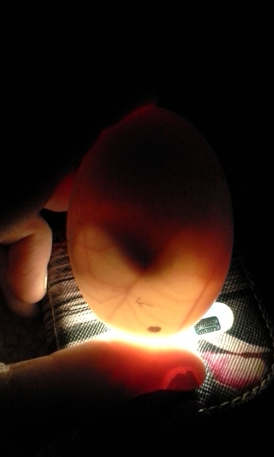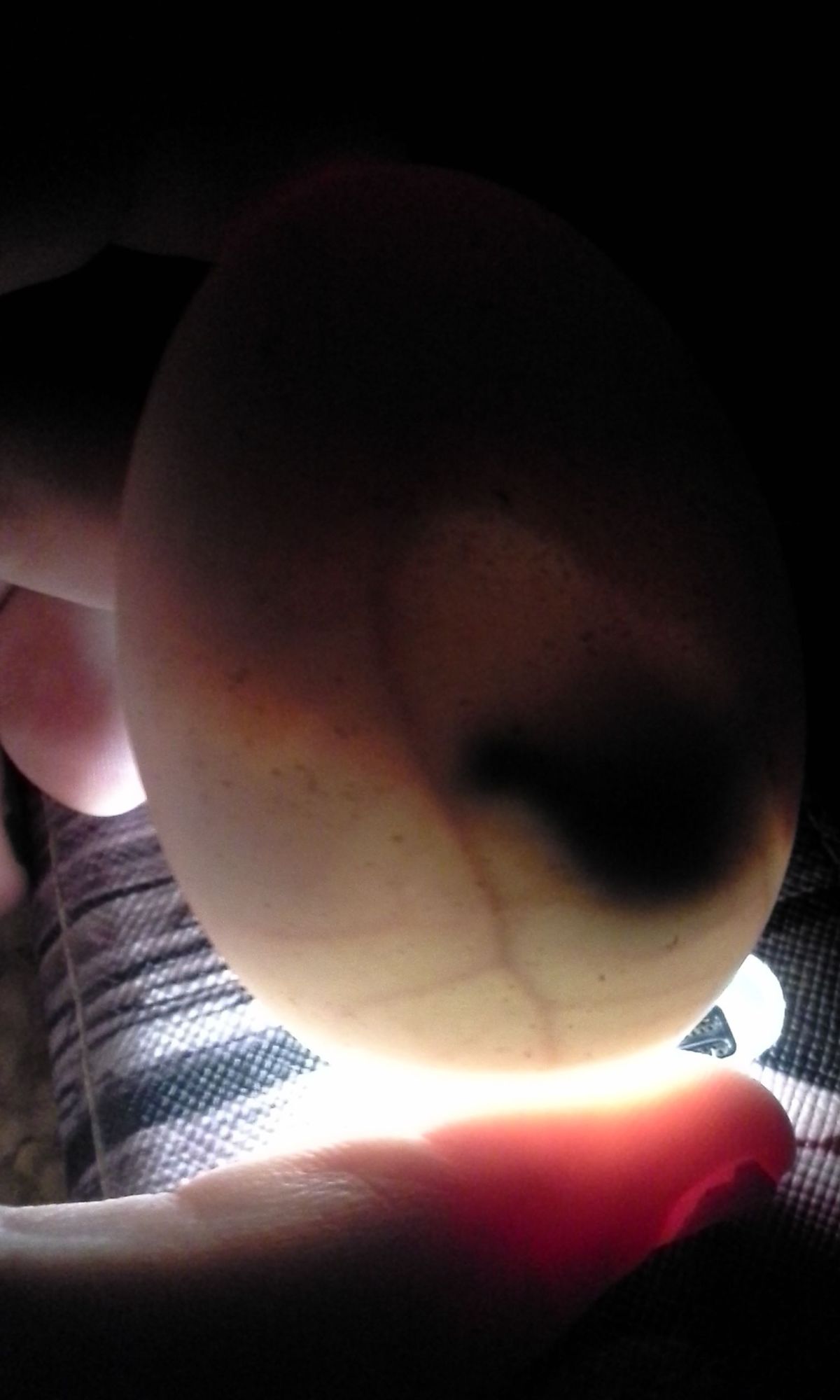 Also, you will see the egg better if you candle from the air sac end. Seems like you are candling from the pointy end.