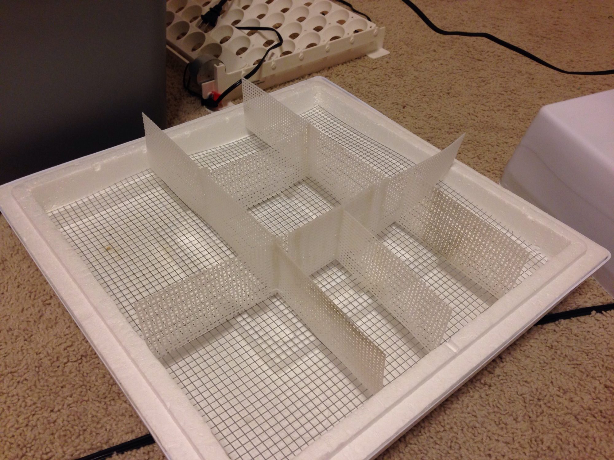 Thanks! I have 6 in that container. I put a styrofoam egg carton top with holes poked through down the middidle sandwiched between eggs in cartons and the strawberry container hoping to get some separation between breeds...
