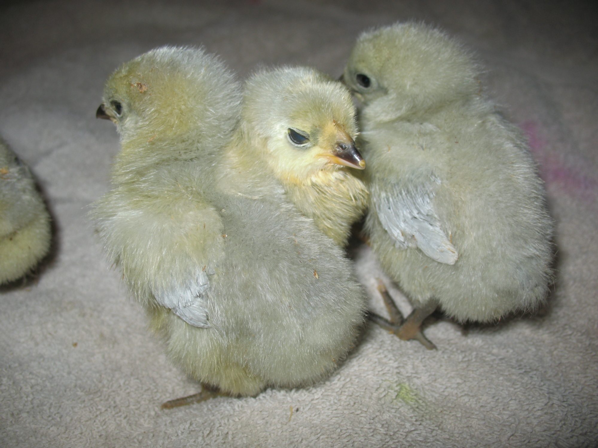 A partridge silkie, a tiny black oegb, and a SLW/EE chick. Lovey was due to hatch 1-2 days before Mary Anne but Lovey was a day late and Mary Anne started a day early because of this Mary Anne hatched first.