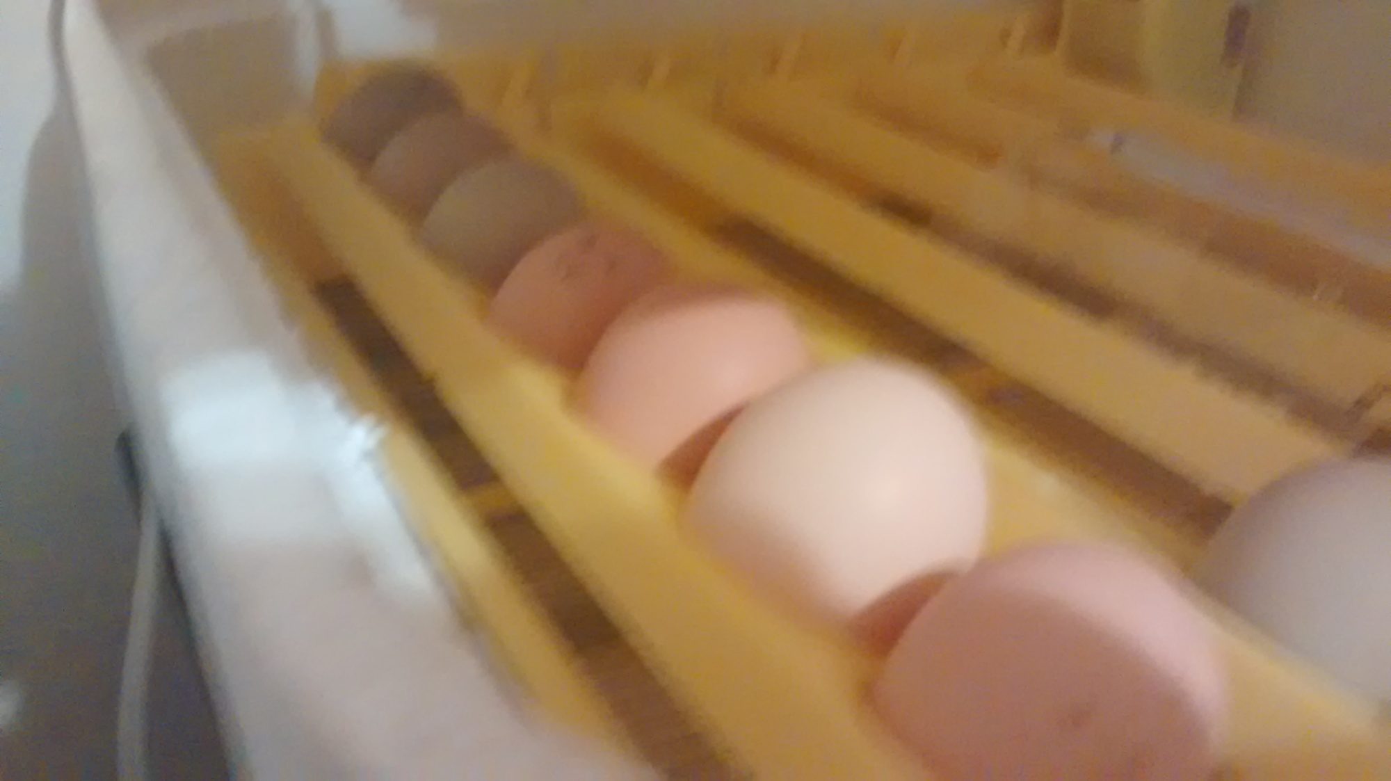 First eggs in the new incubator, 4 each Swedish flower hen and Isbar eggs. Relocated my incubator to a closet in the guest room as I figured the closet temp will be more constant than the main room with the floor furnace in it where I used to keep the old incubator. Here goes nothing!