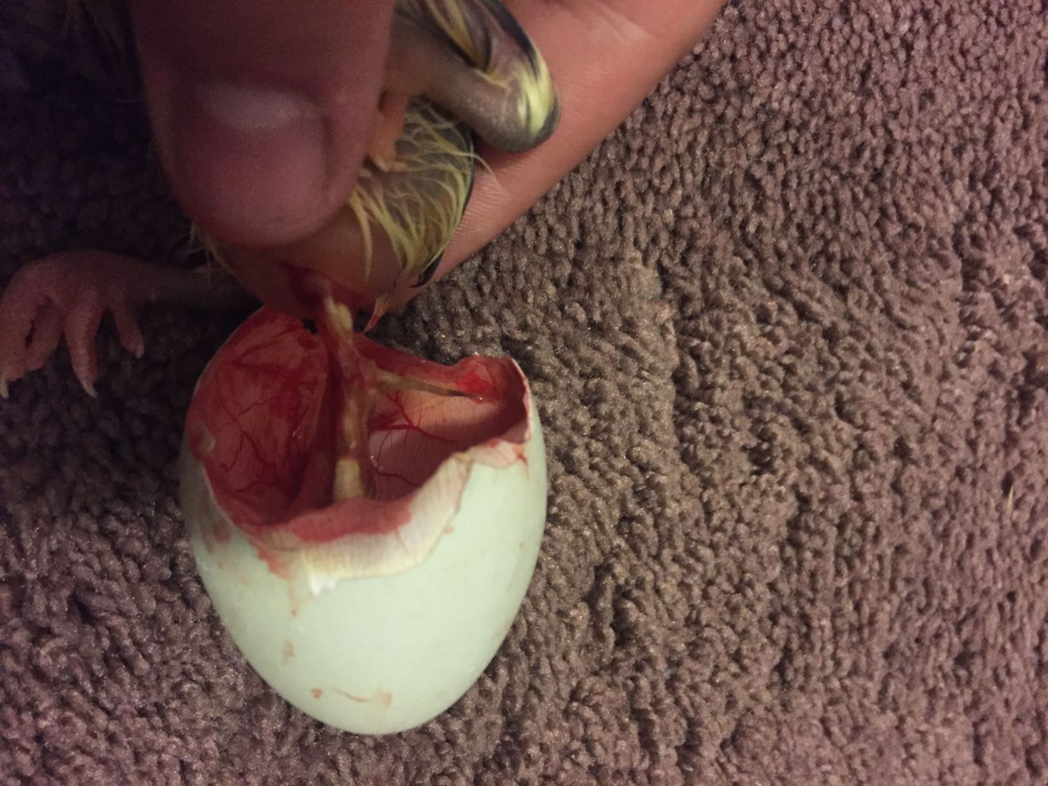 You helped it out? I would put my finger up against the naval area and pull that off from the egg..don't pull from the naval area. Then, having a paper towel on hand, once you have it separated..put the paper towel against that naval..if fact, squeeze the naval area together. You will have to hold it there like that for a while, I am seeing a lot of blood. The baby could make it. May be weak for a while. but I have had them make it after holding it together like this for a while.