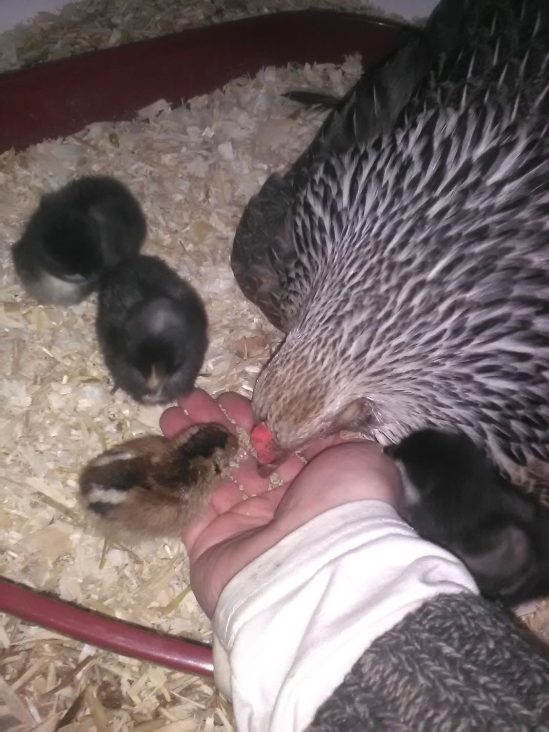 Good morning all! Woke up to 4 more poults in the bator, which brings me to 10 so far. The last 3 hopefuls are pipped and wigglingmy 5 week old silkies are taking turns caring for the poults in the brooder while my NYD HAL BCM chicks are enforcing the rules lol. I need to go get another heart lamp tonight so I can get my big brooder set up and move some of these guys out there. It's just SO cold out!![]()