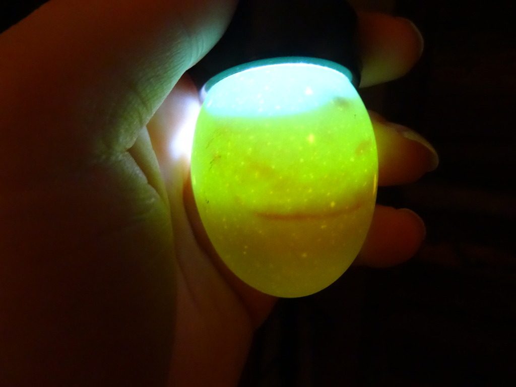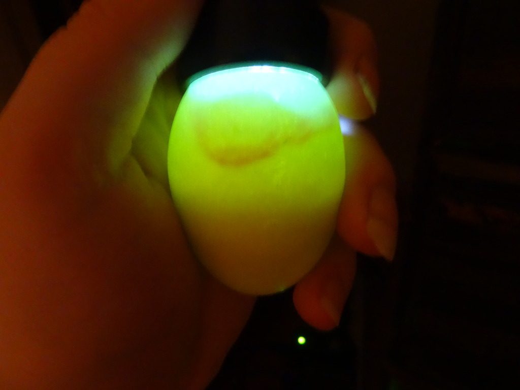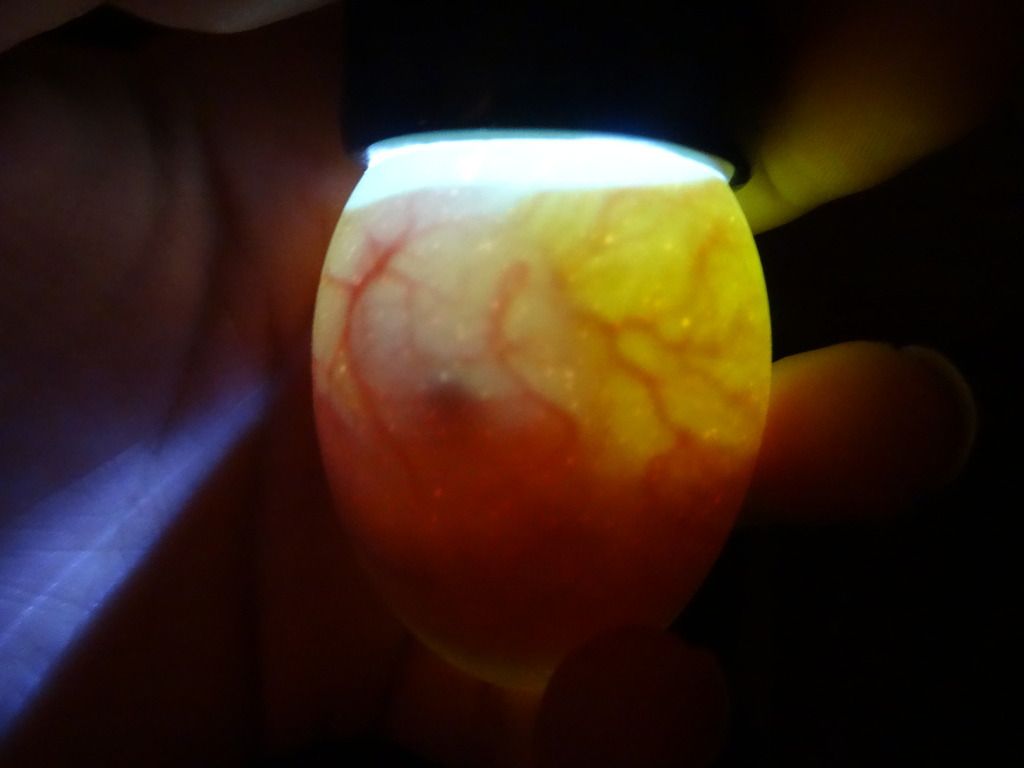 7 of the eggs contained blood rings. All of them are eggs that either had a freely moving air cell or saddle shaped air cell. One of the them was also one of the two cracked eggs I repaired with clear nail polish. Here are some different pictures of the eggs with blood rings.