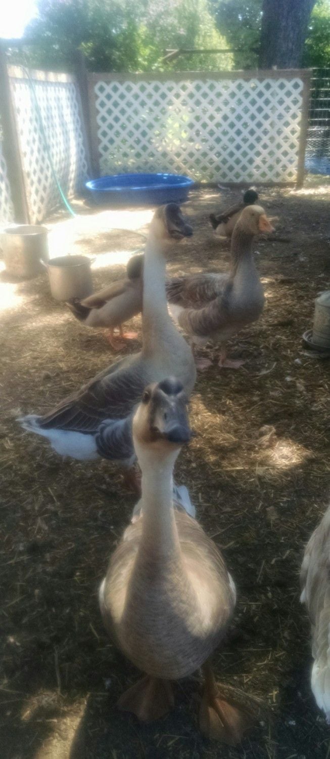 Hi! Several months ago I posted a pic of my Chinese babies and asked for help sexing them. @servpolice made his guesses. Here they are again, about 6 months old. Weeble is in front and Wobble is behind her. Weeble is the smaller of them but is the boss of the waterfowl flock.