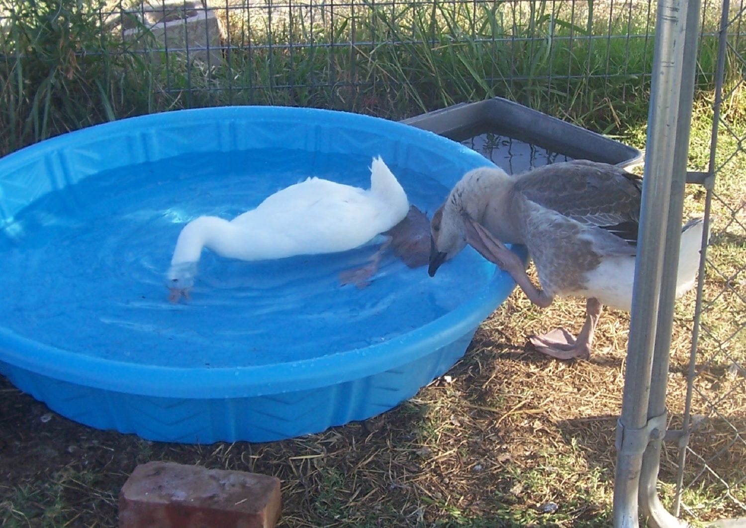 Oh they are so pretty!!! A tiny blow up beach ball? Do they like to play with toys?The pool is filled and Ninya and Charlotte are inquisitive but aprehensive of the big blue thing.